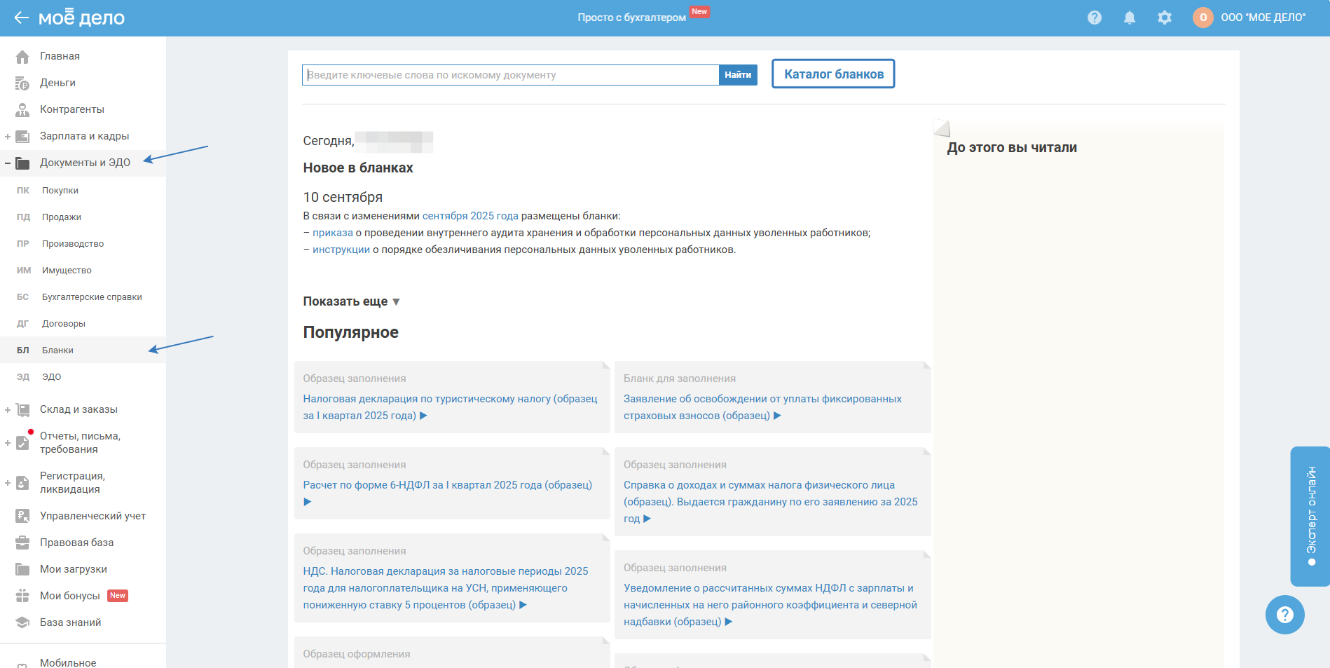 В правой верхней части окна представлен рубрикатор доступных бланков. Некоторые типы бланков доступны для заполнения непосредственно в сервисе (на экране отмечены поля обязательные для заполнения), а некоторые можно только скачать и заполнить уже вручную.