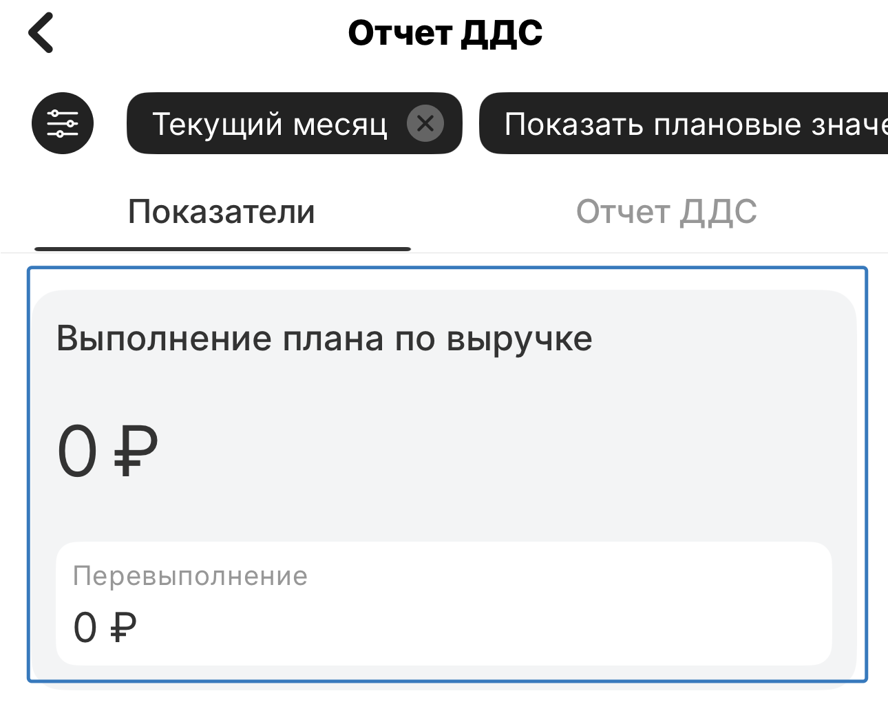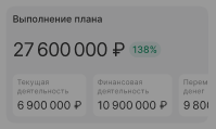 - Выполнение плана — указывается процент выполнения плана. Если плановое значение не установлено в периоде, то процент выполнения показан не будет.