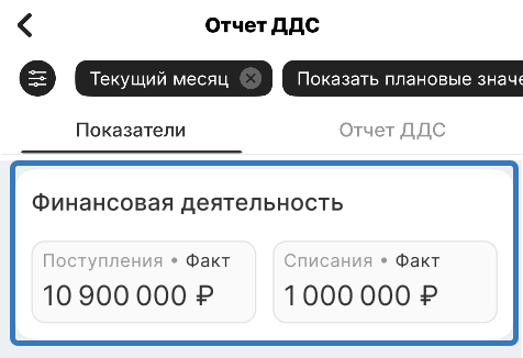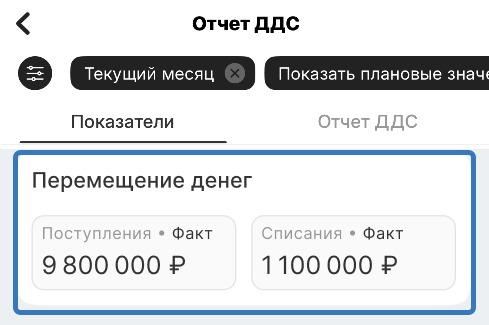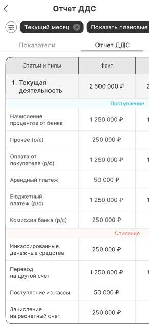 - Поступления факт = Текущая деятельность поступления факт + Финансовая деятельность поступления факт + Перемещение денег факт.