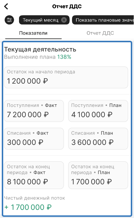 - Остаток на конец периода факт = Фактический остаток на начала период по статье текущая деятельность + Текущая деятельность поступления факт - Текущая деятельность списания факт.