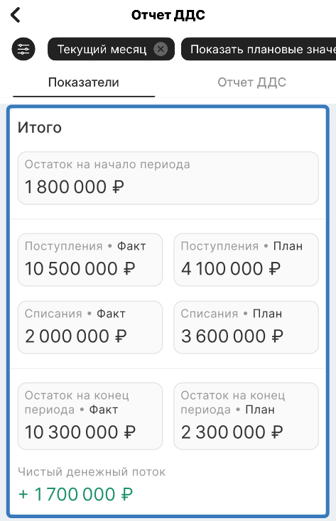 Здесь представлена информация по показателям и сам отчёт ДДС.