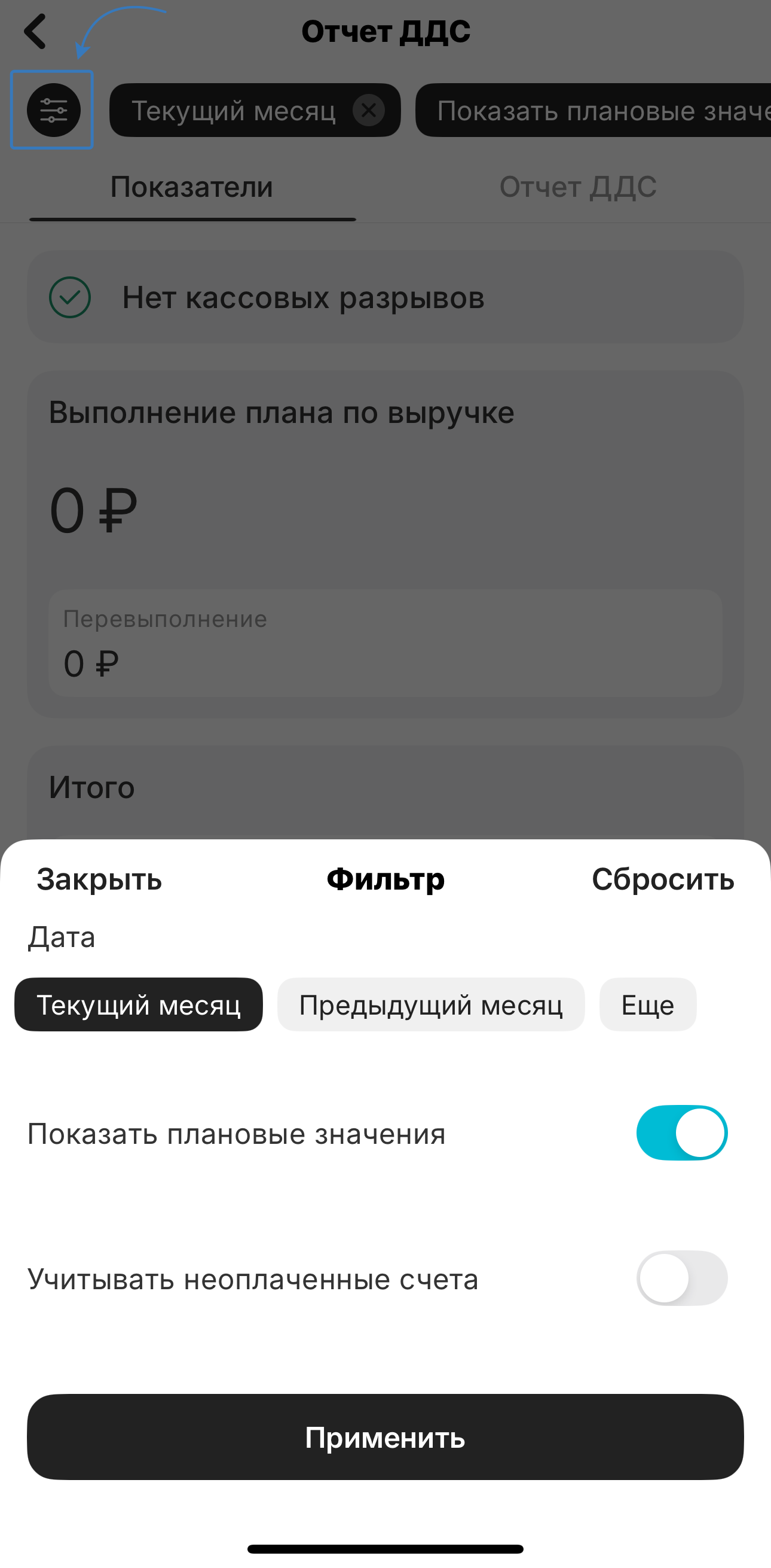 Для просмотра данных страницы «Отчёт ДДС» вы можете воспользоваться фильтром: