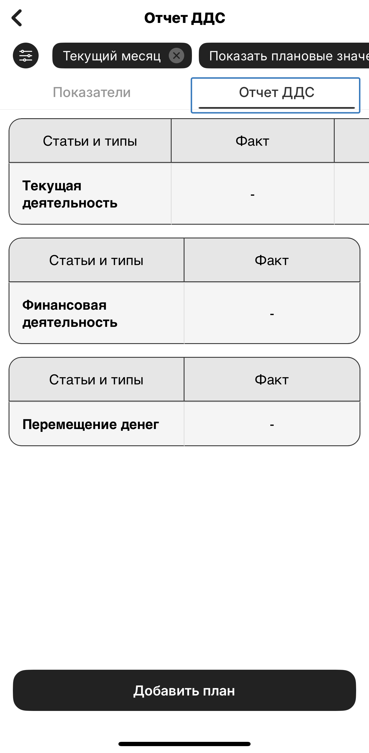 - Поступления план = Текущая деятельность поступления план + Финансовая деятельность поступления план + Перемещение денег поступления план.