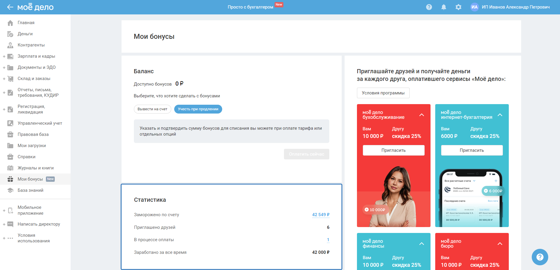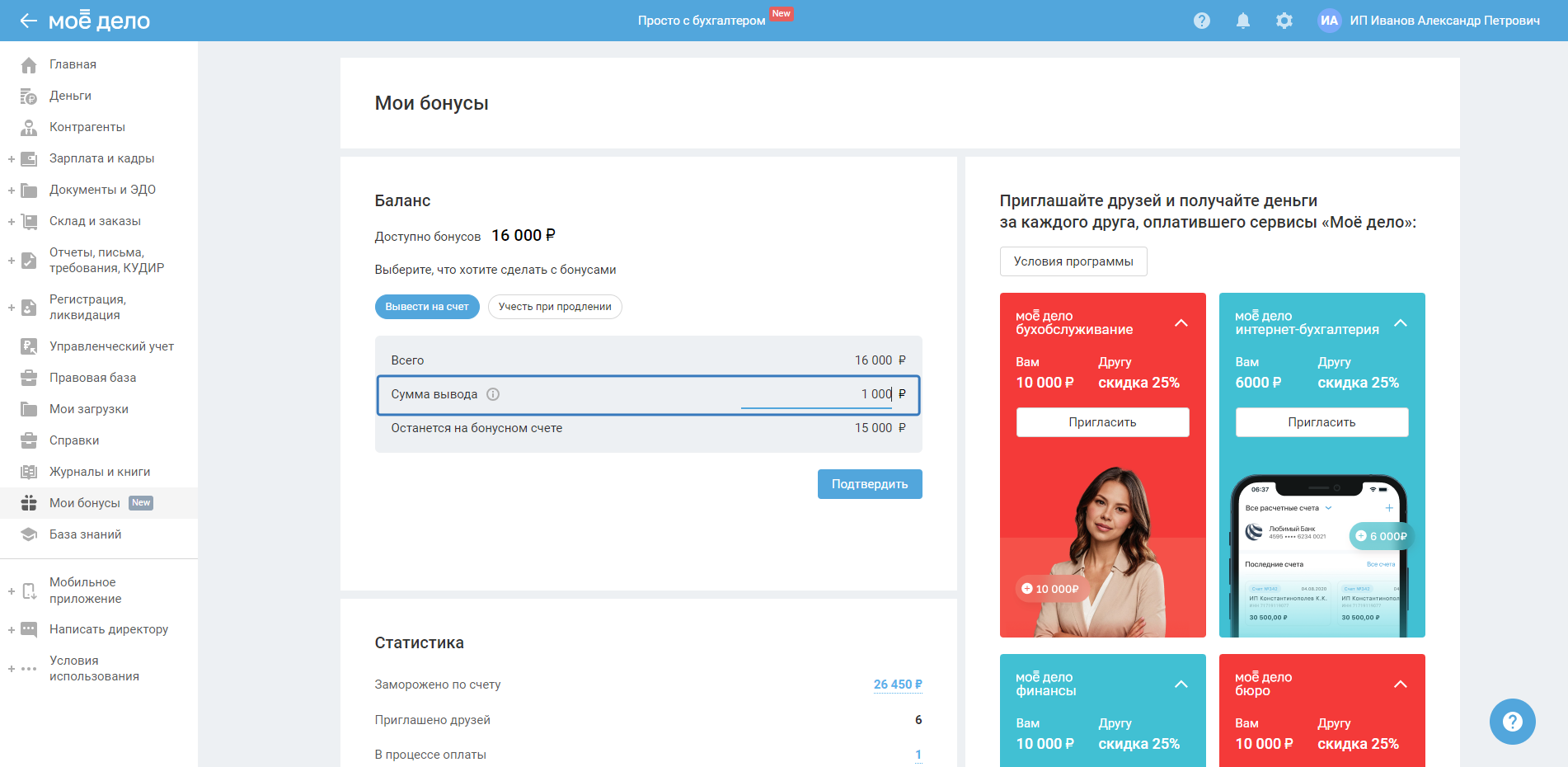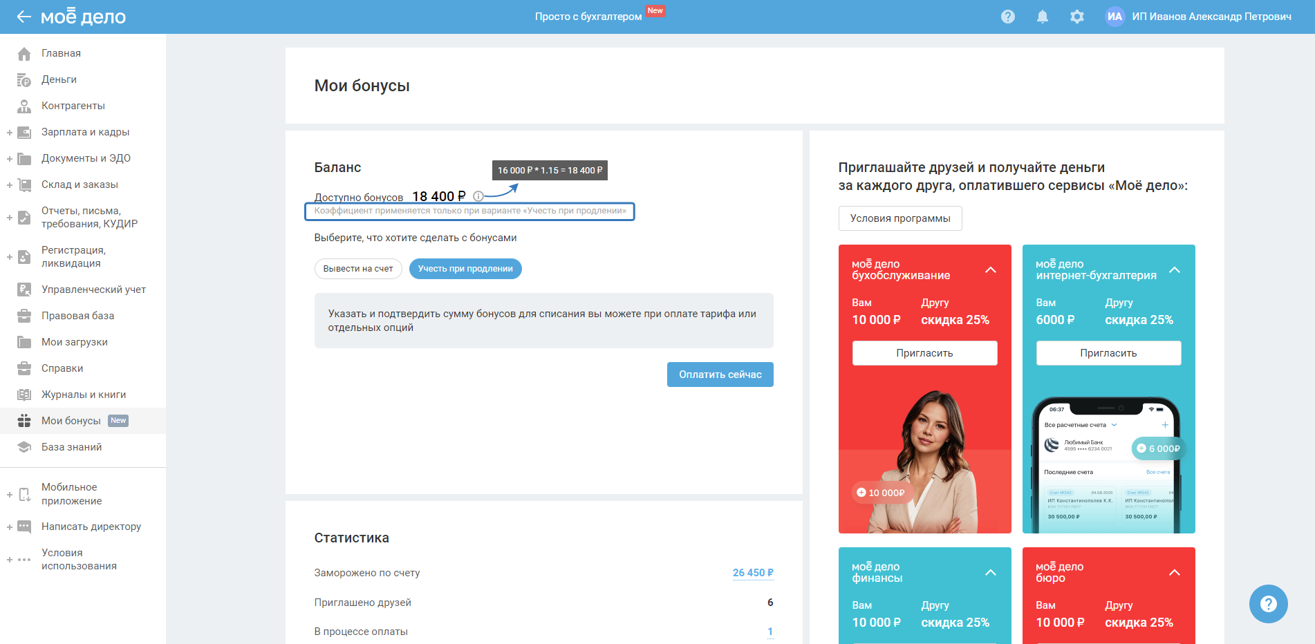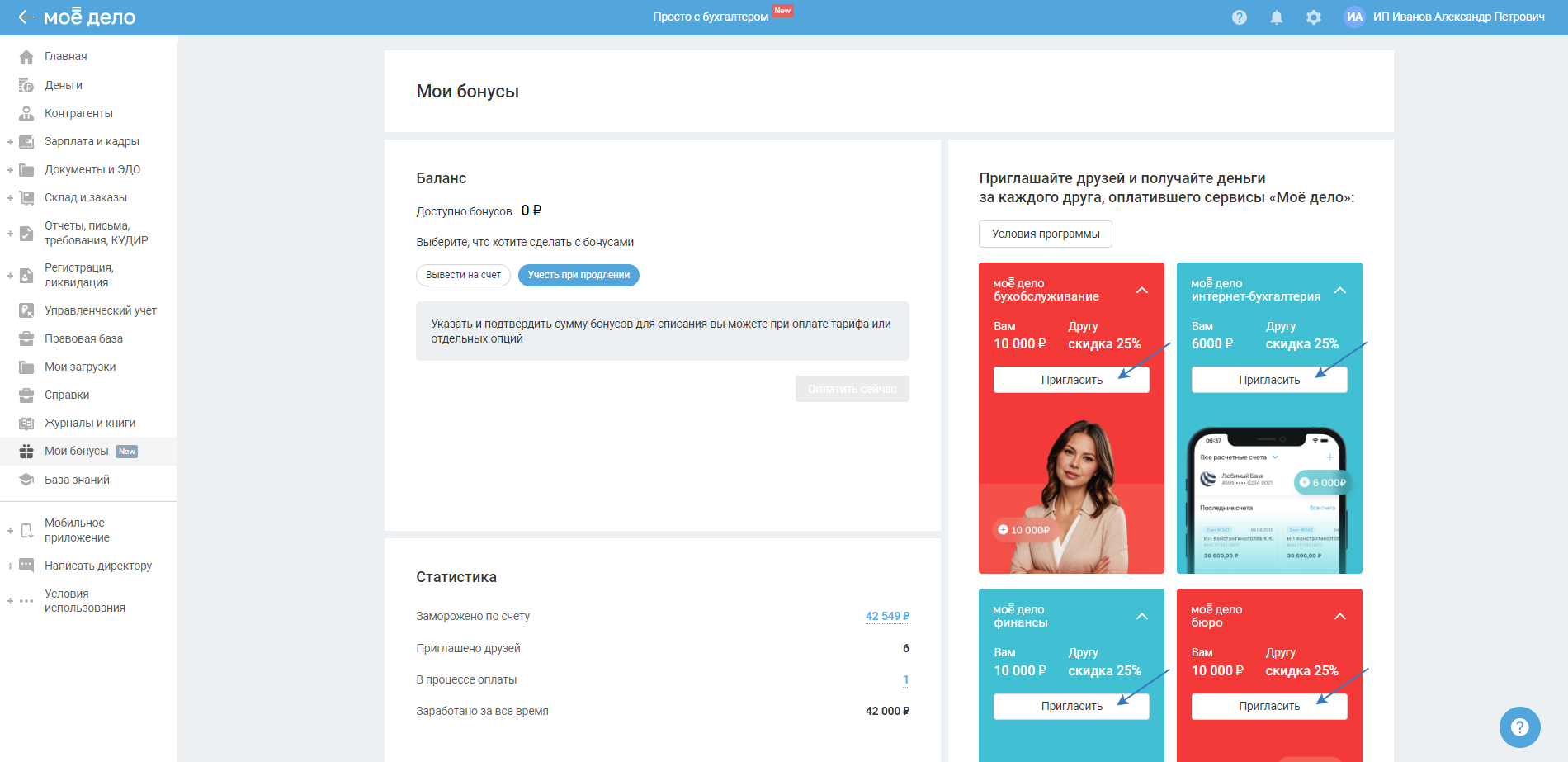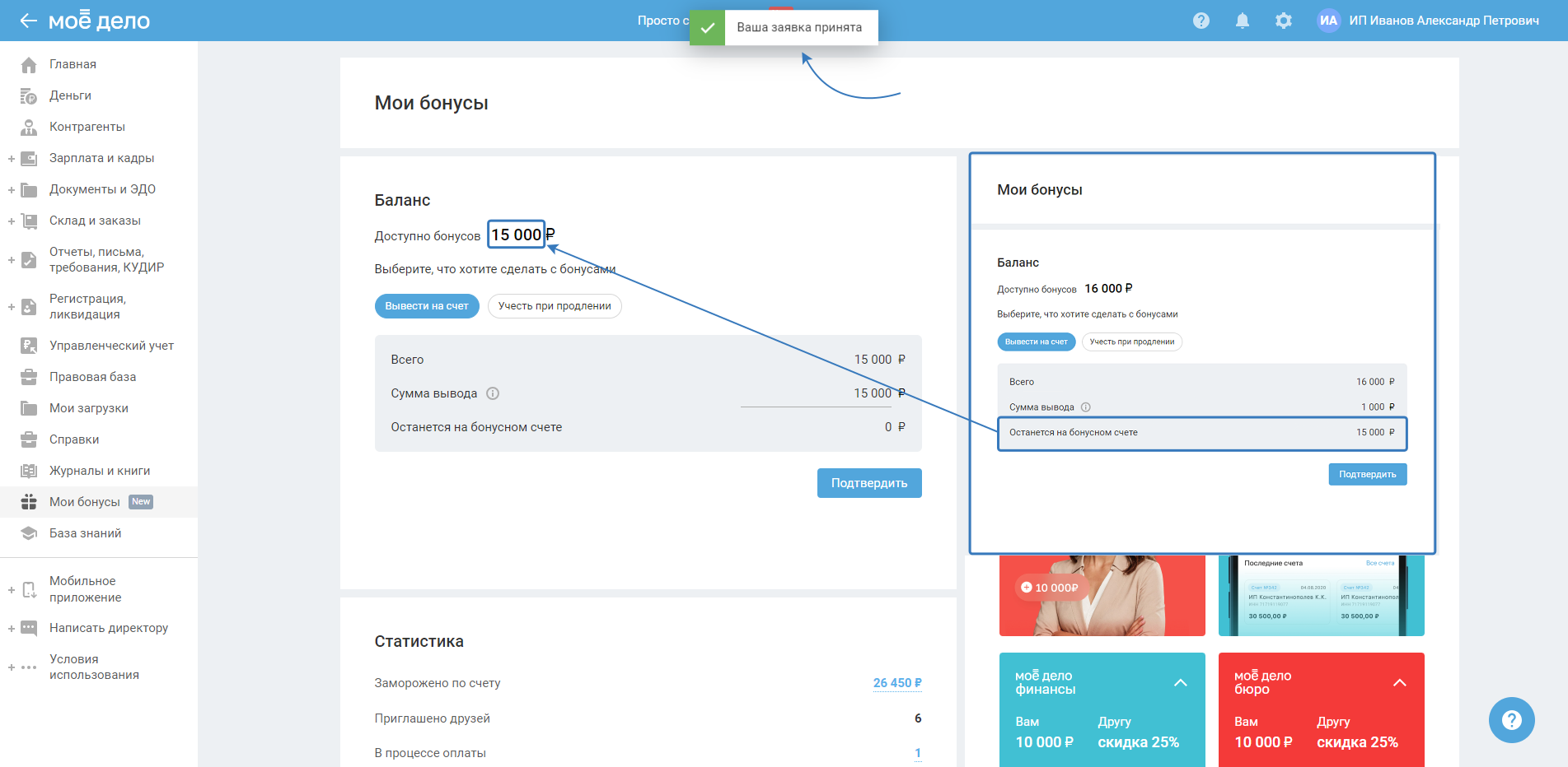 С помощью функционала «Мои бонусы» вы можете использовать накопленные бонусы, полученные за каждого приведённого вами друга: