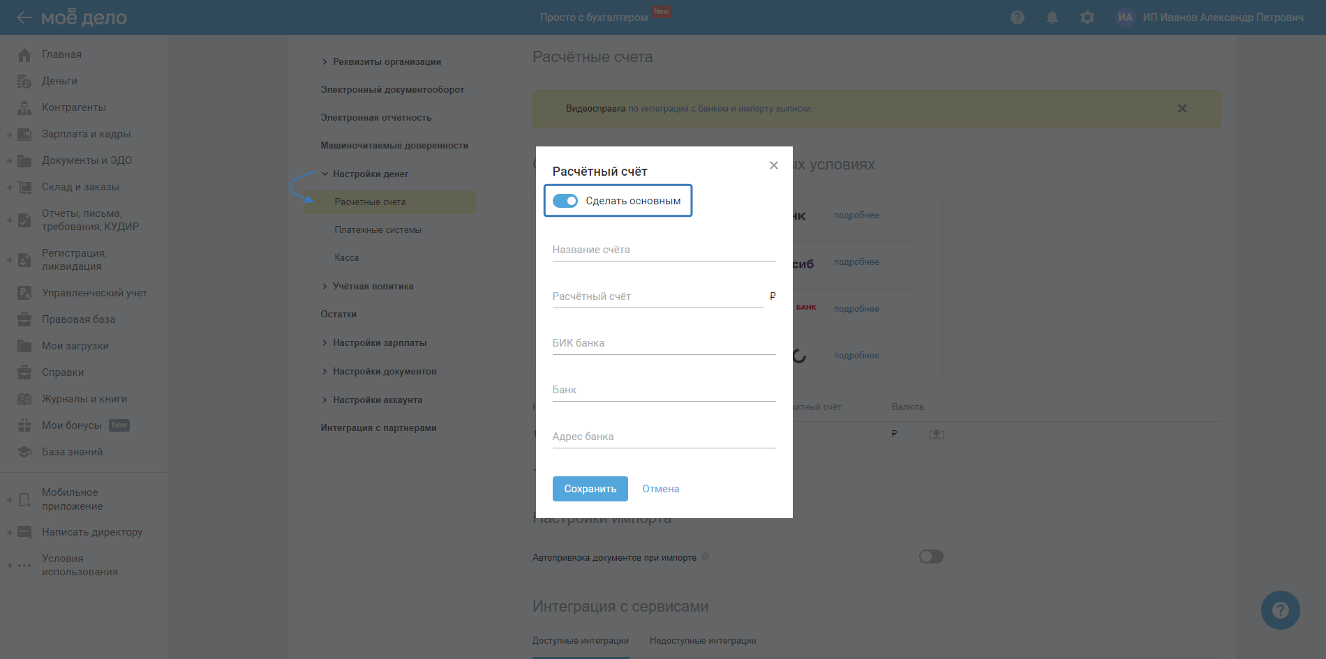 - либо уже ранее добавленный р/сч. Тогда нажмите на него и включите в открывшемся окне тумблер «Сделать основным», сохраните изменения;