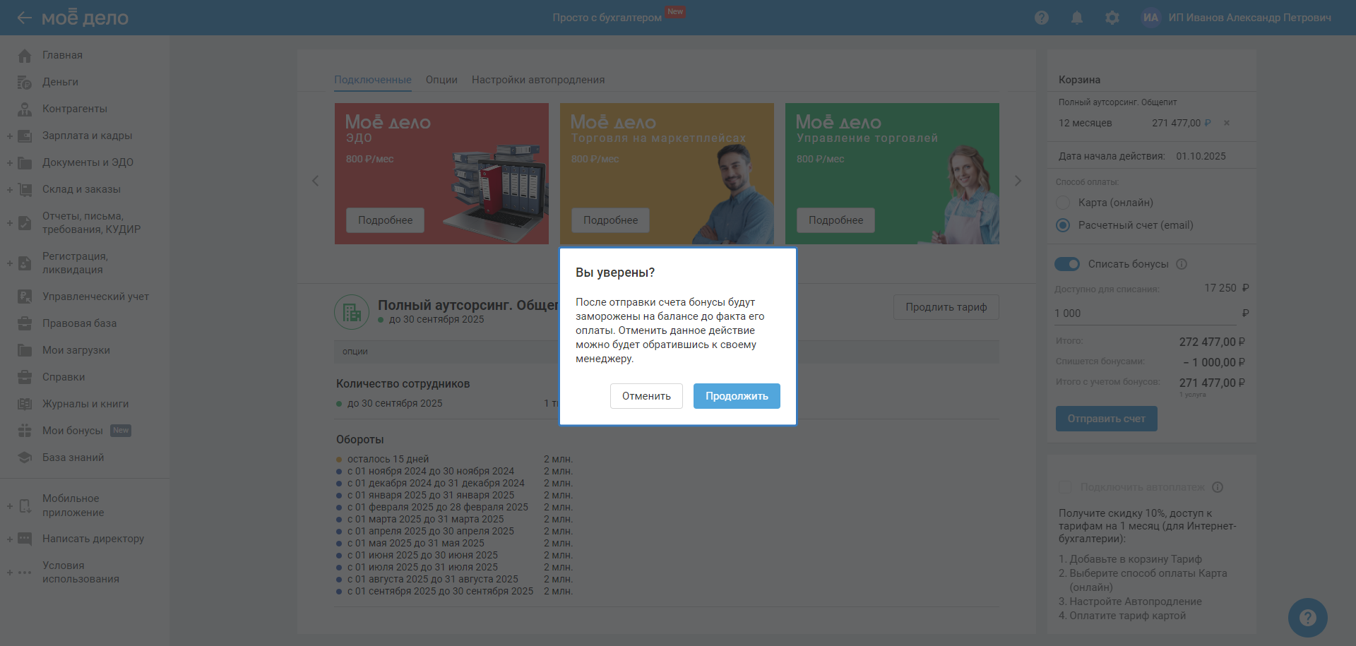 Важно. После отправки счёта бонусы будут заморожены на балансе до факта его оплаты. Отменить данное действие можно будет обратившись к своему менеджеру.