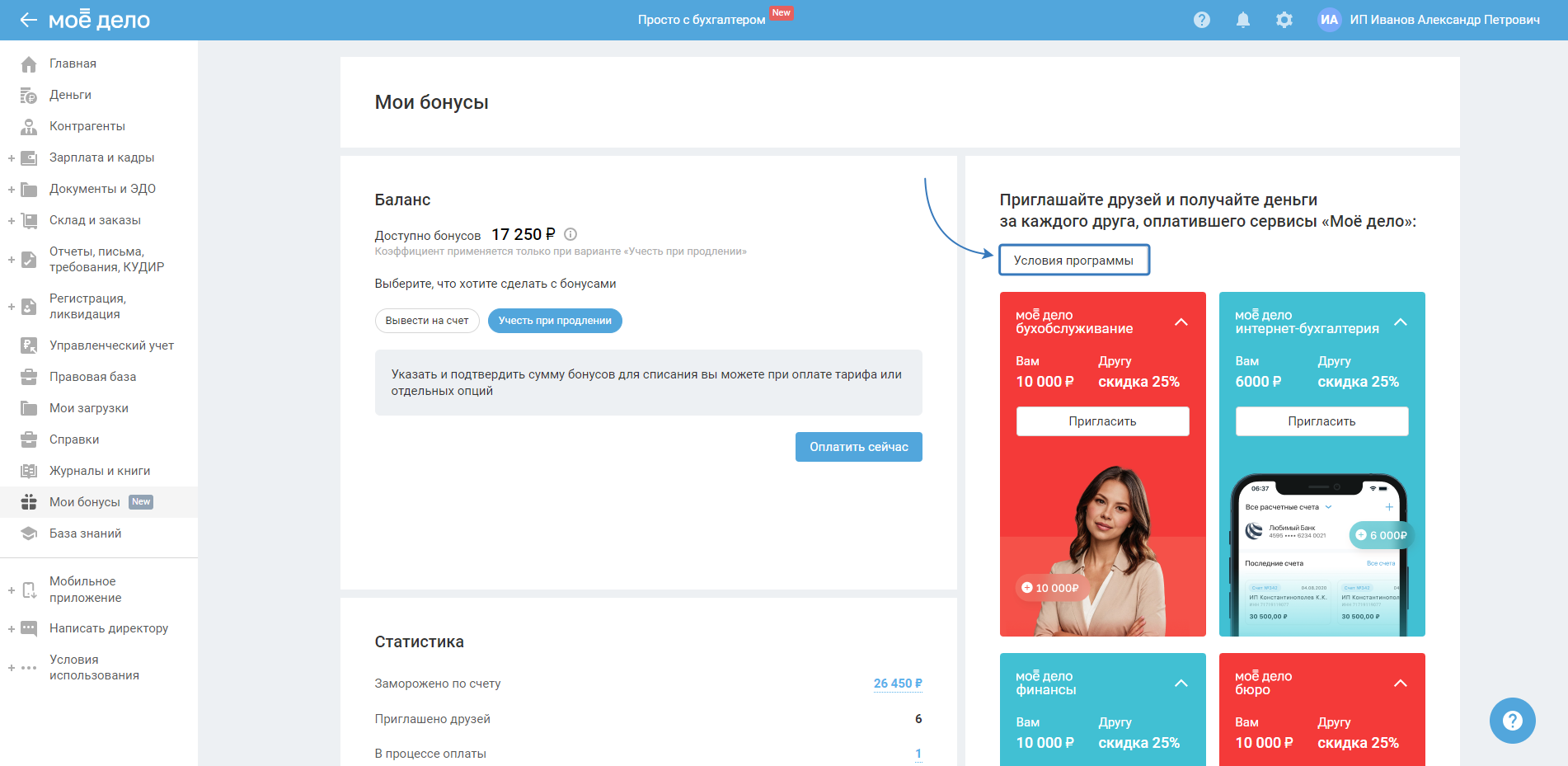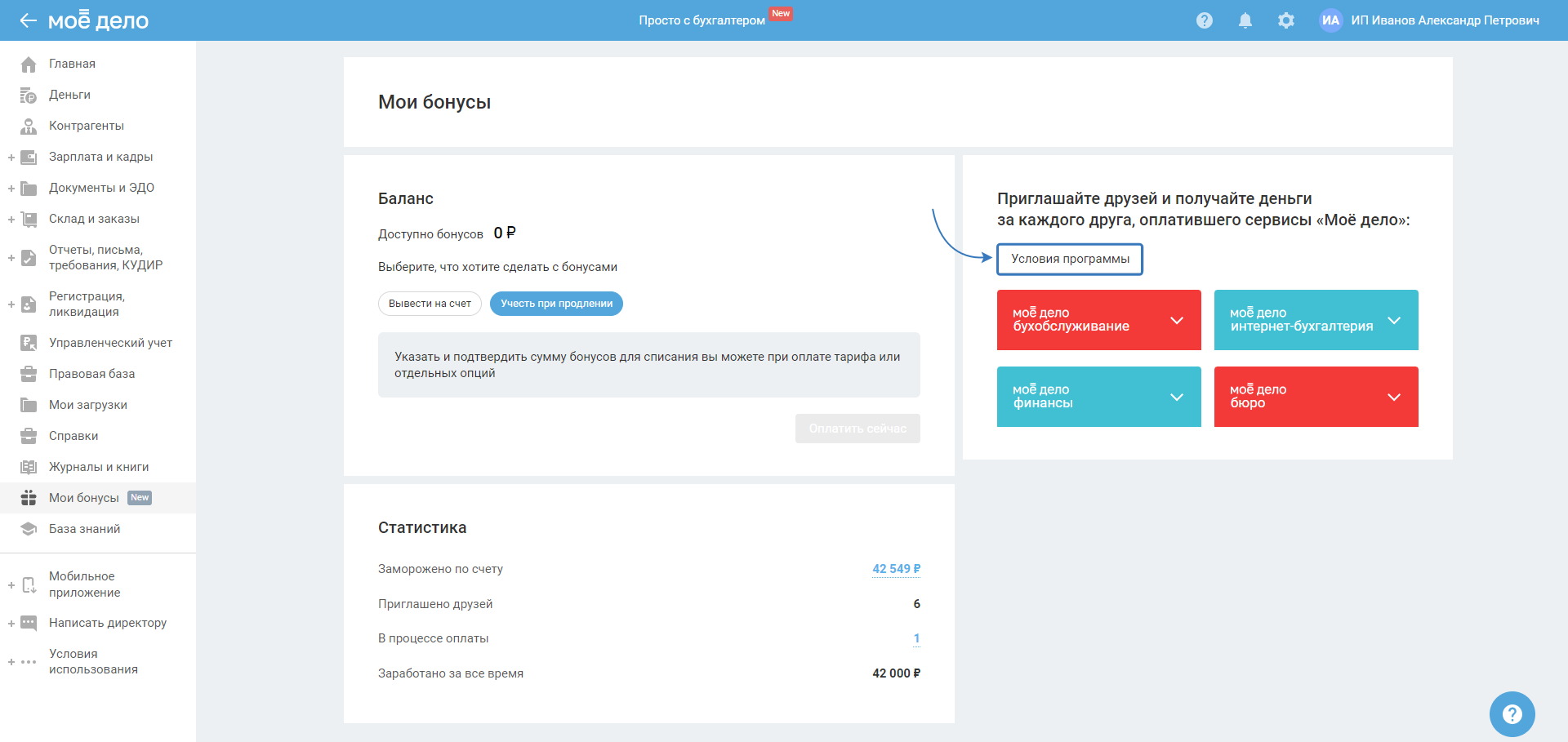 На странице «Мои бонусы» представлены следующие разделы: баланс, статистика, виджеты продуктов компании с возможностью пригласить друзей и условия программы: