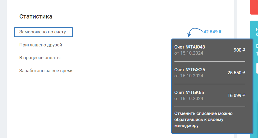 Пока не будет оплачен данный счёт, сумма бонусов будет заморожена и видна в разделе «Статистика».