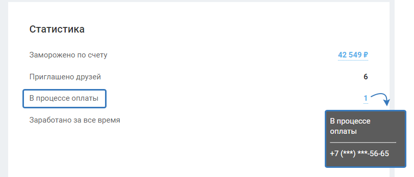 - в строке «В процессе оплаты» — показывается количество ваших друзей, прошедших регистрацию по реферальной ссылке, но не оплатившие тарифы сервиса. При нажатии на детализацию вы увидите данные в формате телефонного номера, в котором видно только последние 4 цифры: