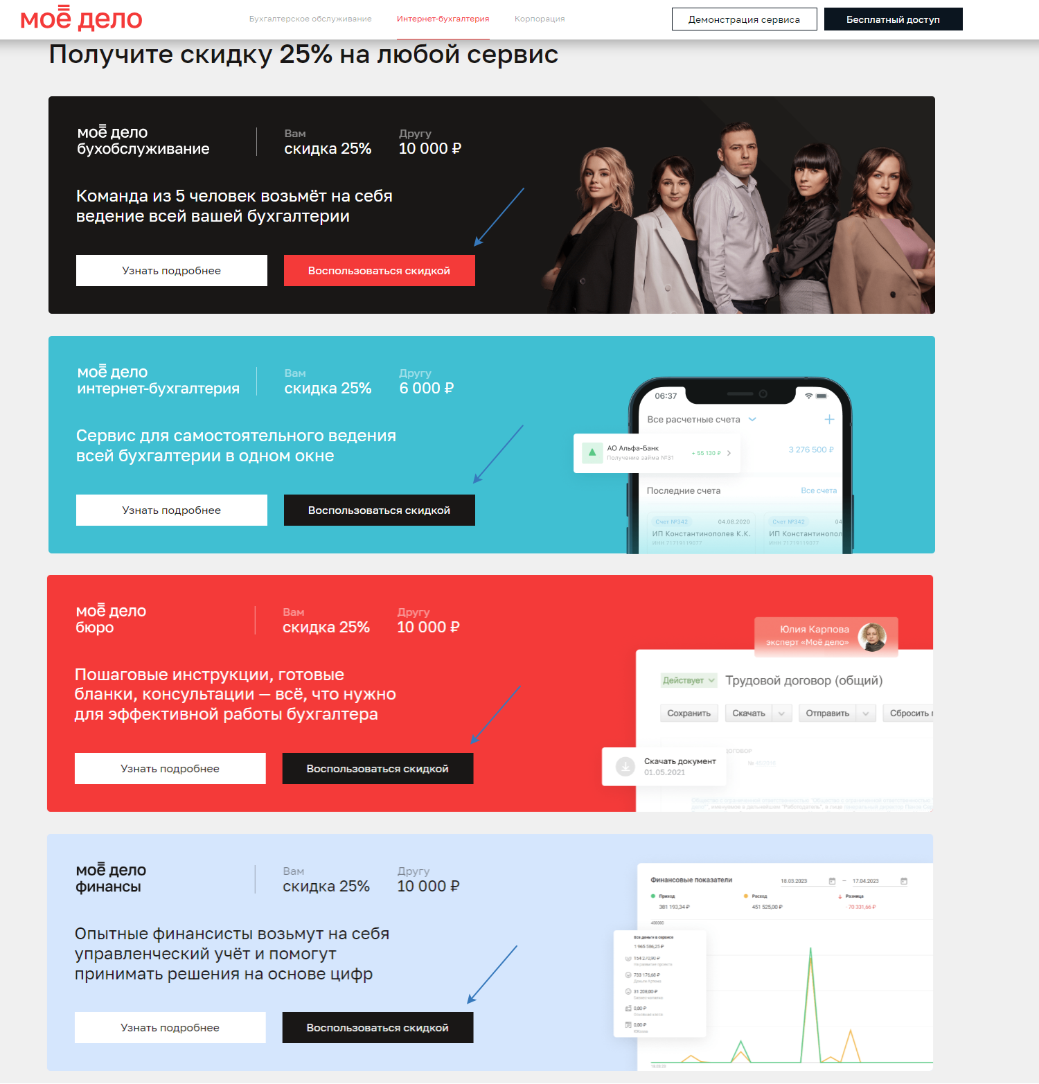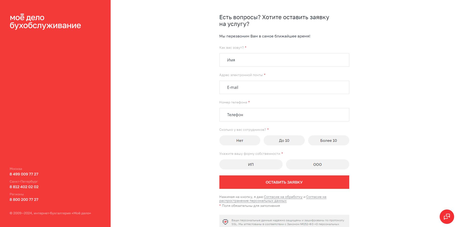 Например при выборе продукта по бухобслуживанию нужно заполнить следующие данные, нажать кнопку «Оставить заявку»: