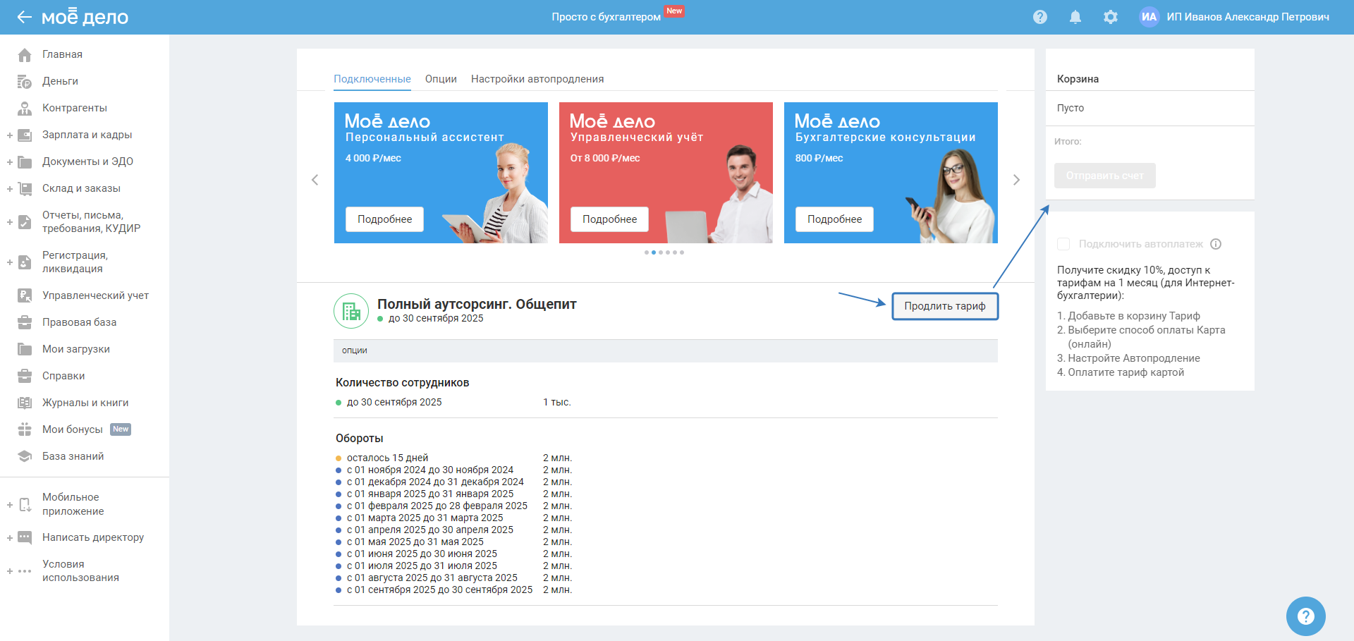 Для автоматического заполнения корзины нажмите «Продлить тариф»: