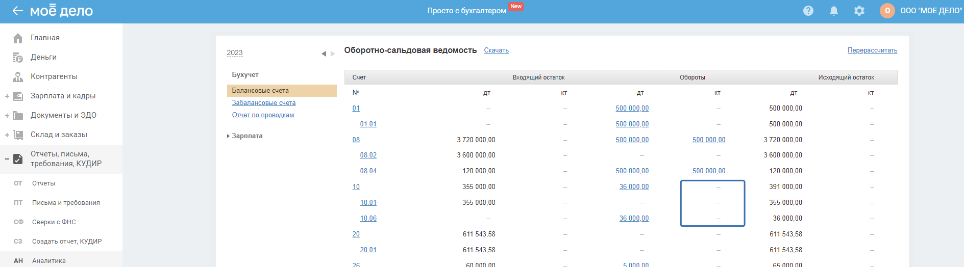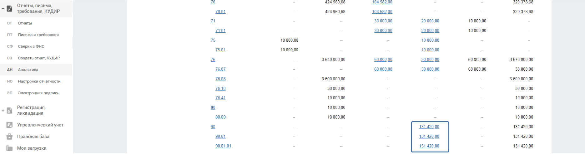 В отчёте «Отриц. остатки по бух. счетам» вы увидите организации, имеющие отрицательные исходящие остатки по бух. счетам. Проверить их наличие вы можете в разделе «Отчёты, письма, требования, КУДИР — Аналитика» по оборотно-сальдовой ведомости: