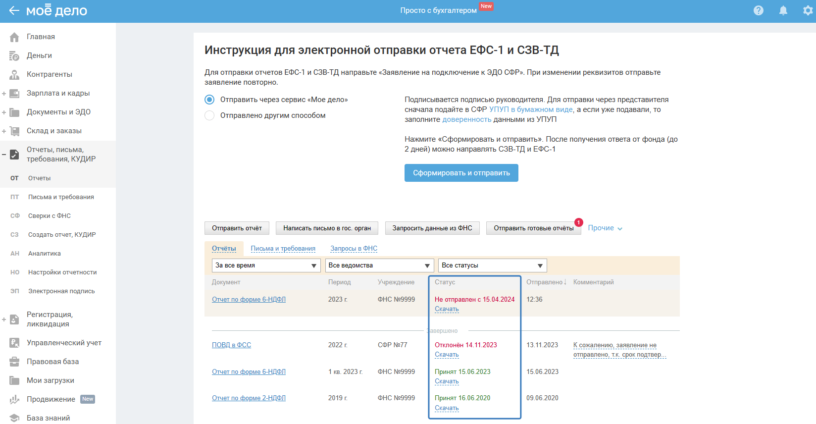 - Отклонён — в разделе «Отчёты, письма, требования, КУДИР — Отчёты» статус отчёта «Отклонён».