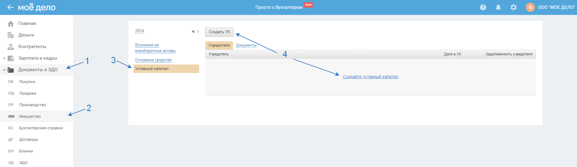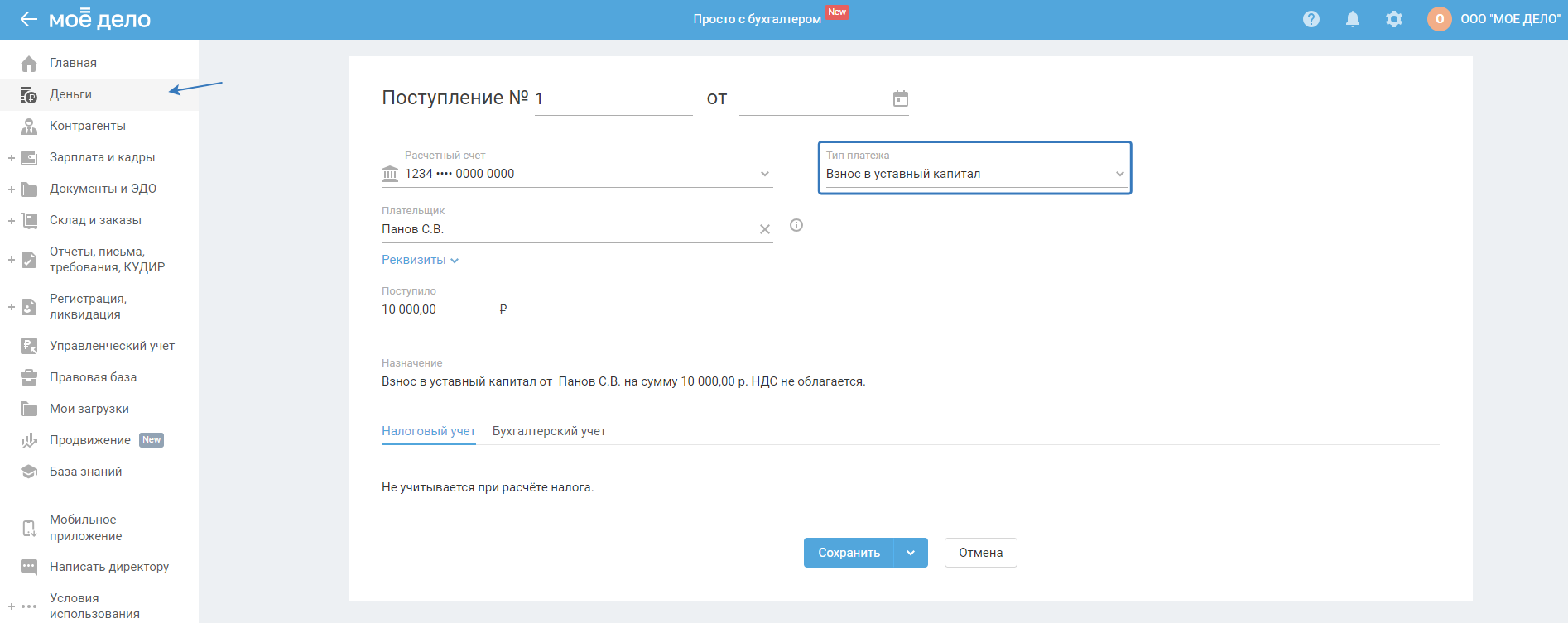 Взнос в уставный капитал в сервисе отражается по инструкции.