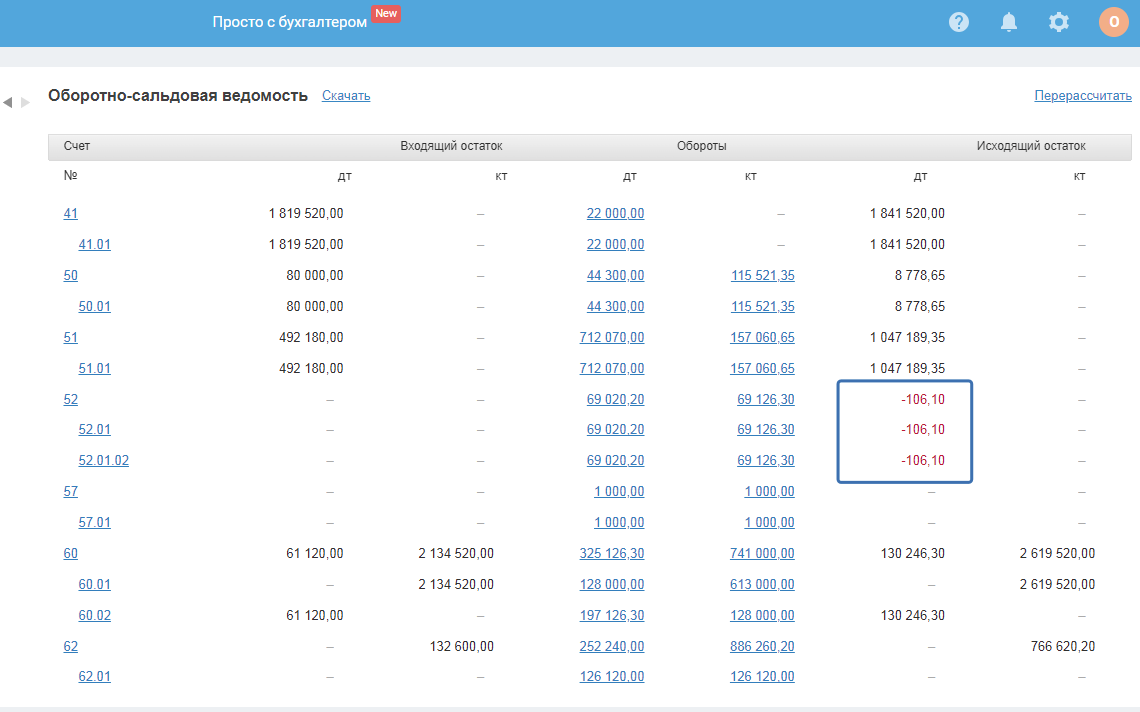 Отрицательные остатки по бух. счетам