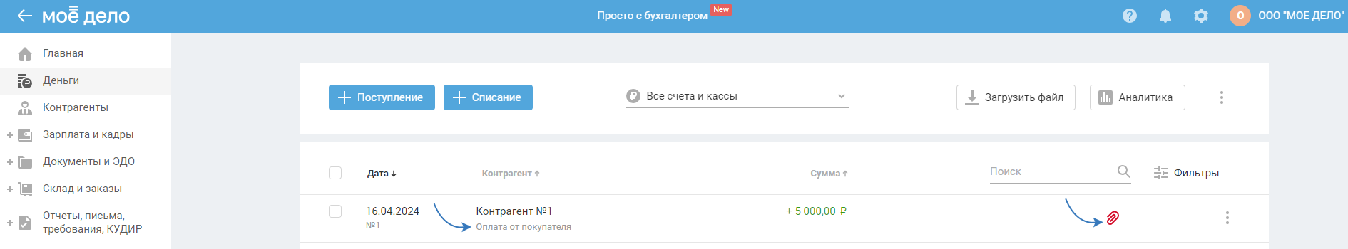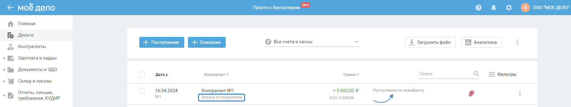 Чтобы внести исправления, перейдите во вкладку «Деньги», выберите поступления с типами «Оплата от покупателя», «Прочее», «Перевод со счёта». Те поступления, которые относятся к эквайрингу, должны отражаться в сервисе по инструкции.