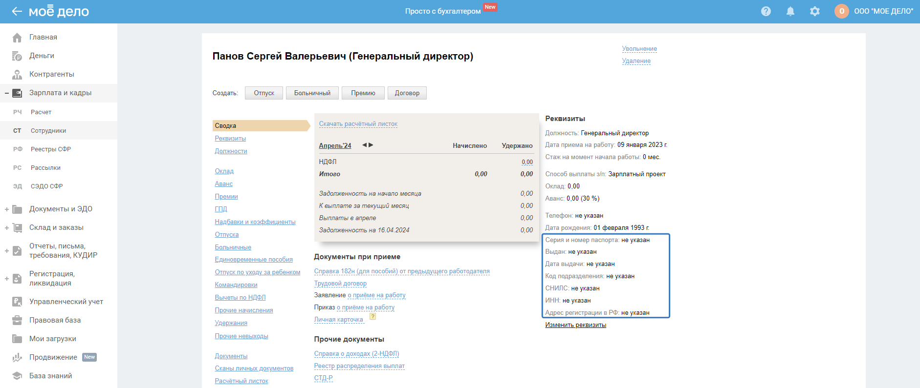 - Нет реквизитов по сотрудникам.