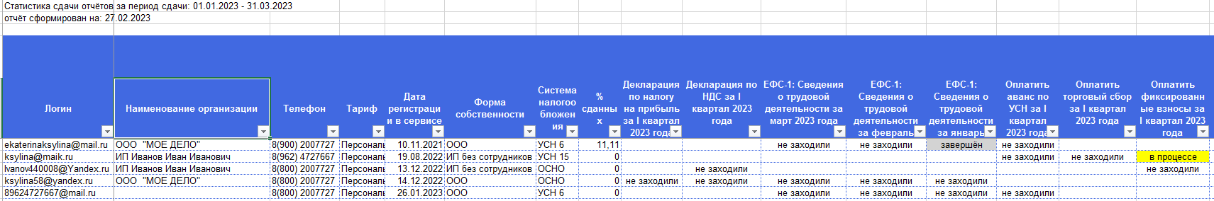 В отчёте вы увидите данные пользователей ИП и ООО (логин, наименование организации, телефон, тариф, дату регистрации в сервисе, форму собственности и систему налогообложения), статистику сдачи отчётов за период сдачи и статусы по ним: