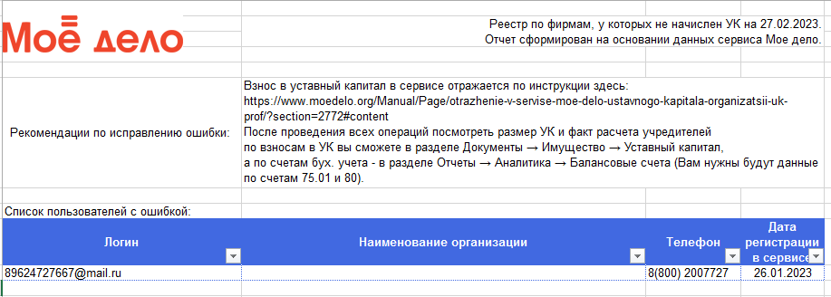 В отчёте «Не начислен УК» вы увидите по каким организациям не был начислен уставный капитал: