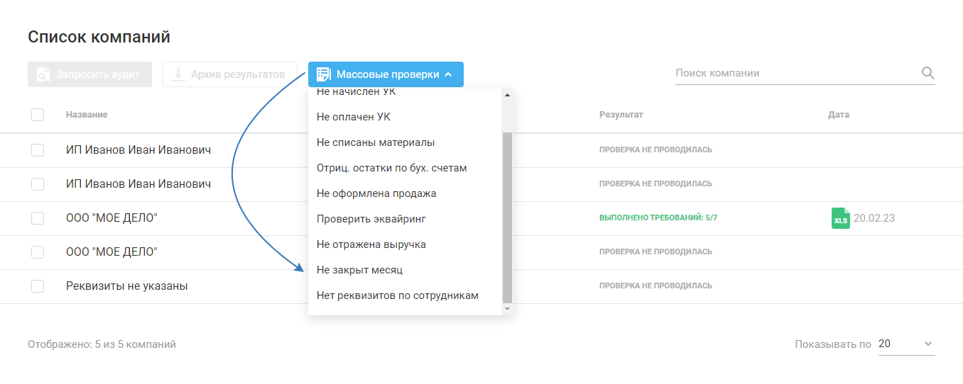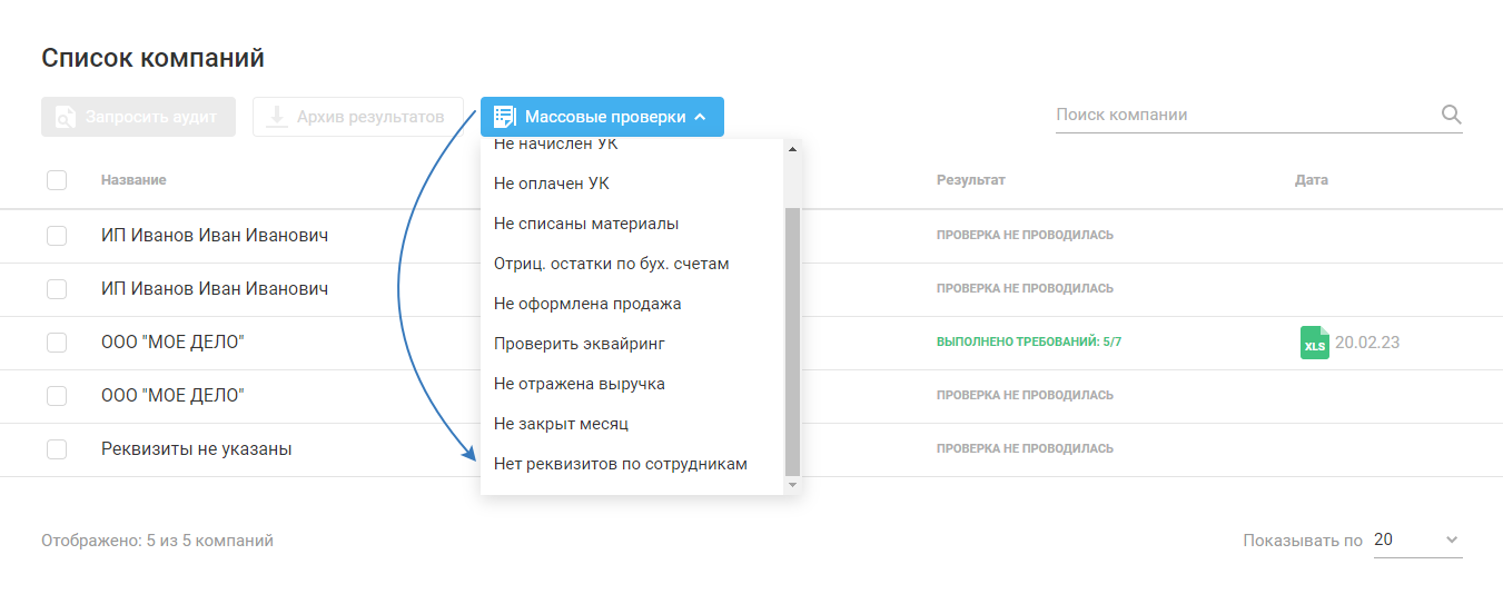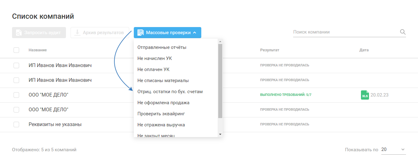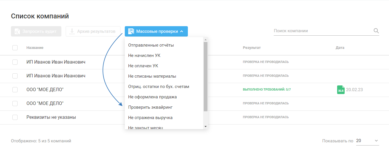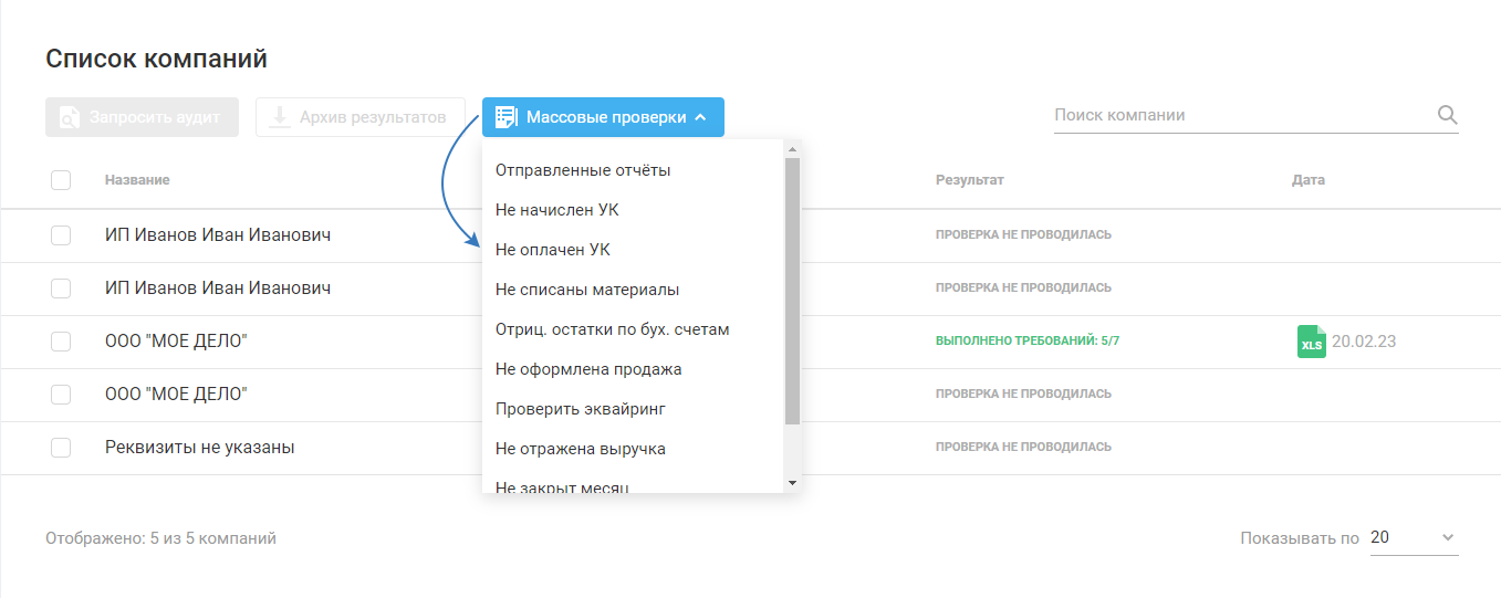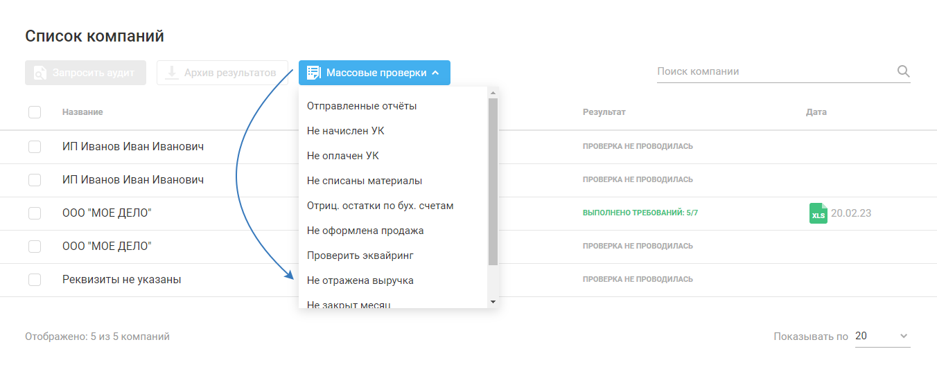 Выберите «Массовые проверки»: