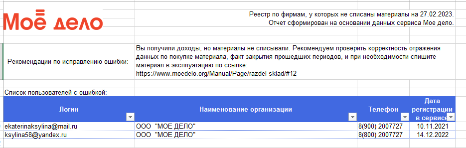 Если в отчёте присутствуют организации, то рекомендуем проверить корректность учёта и при необходимости списать материалы по инструкции.