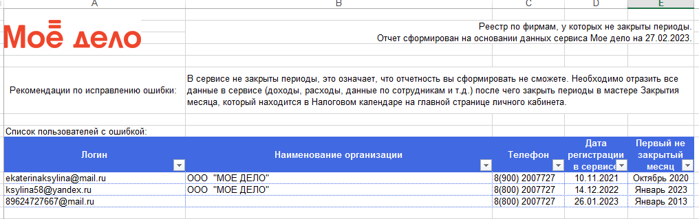 Например, если в Календаре событий не закрыт январь, то в отчёте отразится информация по этому логину и месяц январь 2023 года: