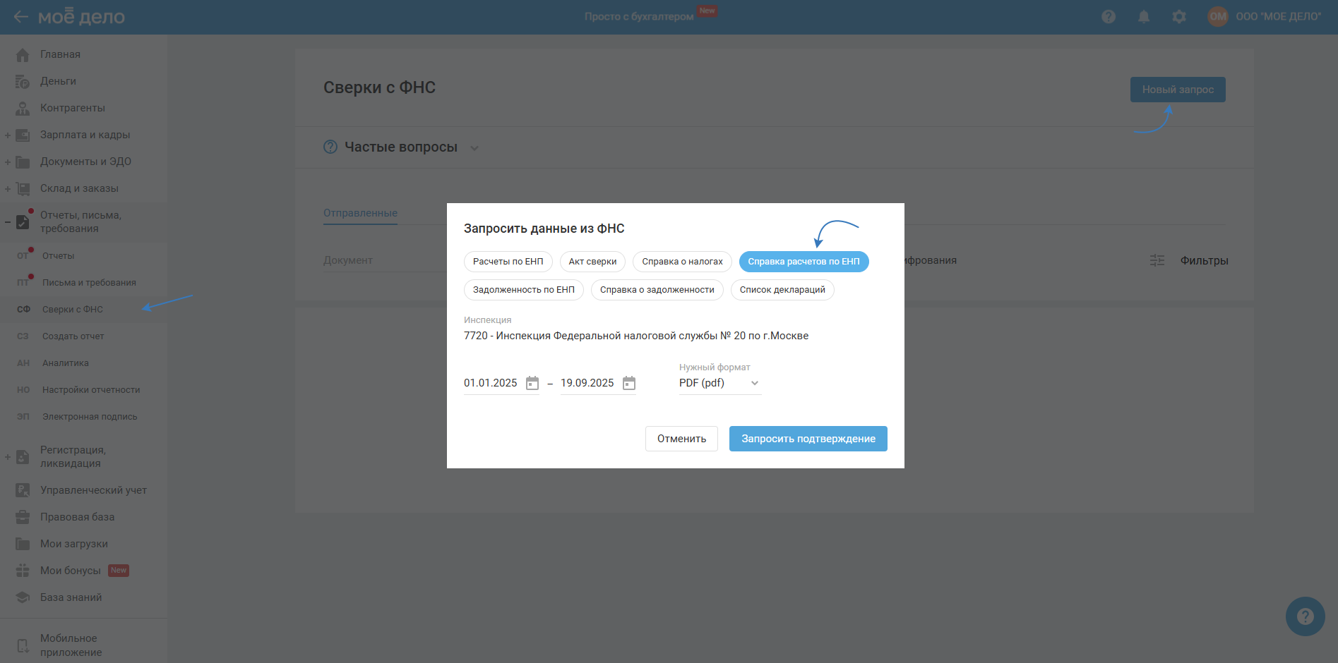 В кабинете сервиса «Моё дело» перейдите в раздел «Отчёты, письма, требования — Сверки с ФНС», нажмите «Новый запрос» и запросите справку расчётов по ЕНП с ФНС: