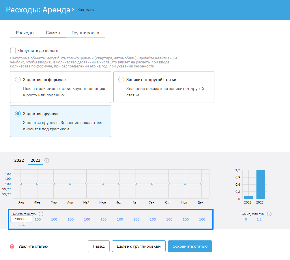 • Для варианта «распределить на год» указанное значение будет распределено равными частями по 12 месяцам.