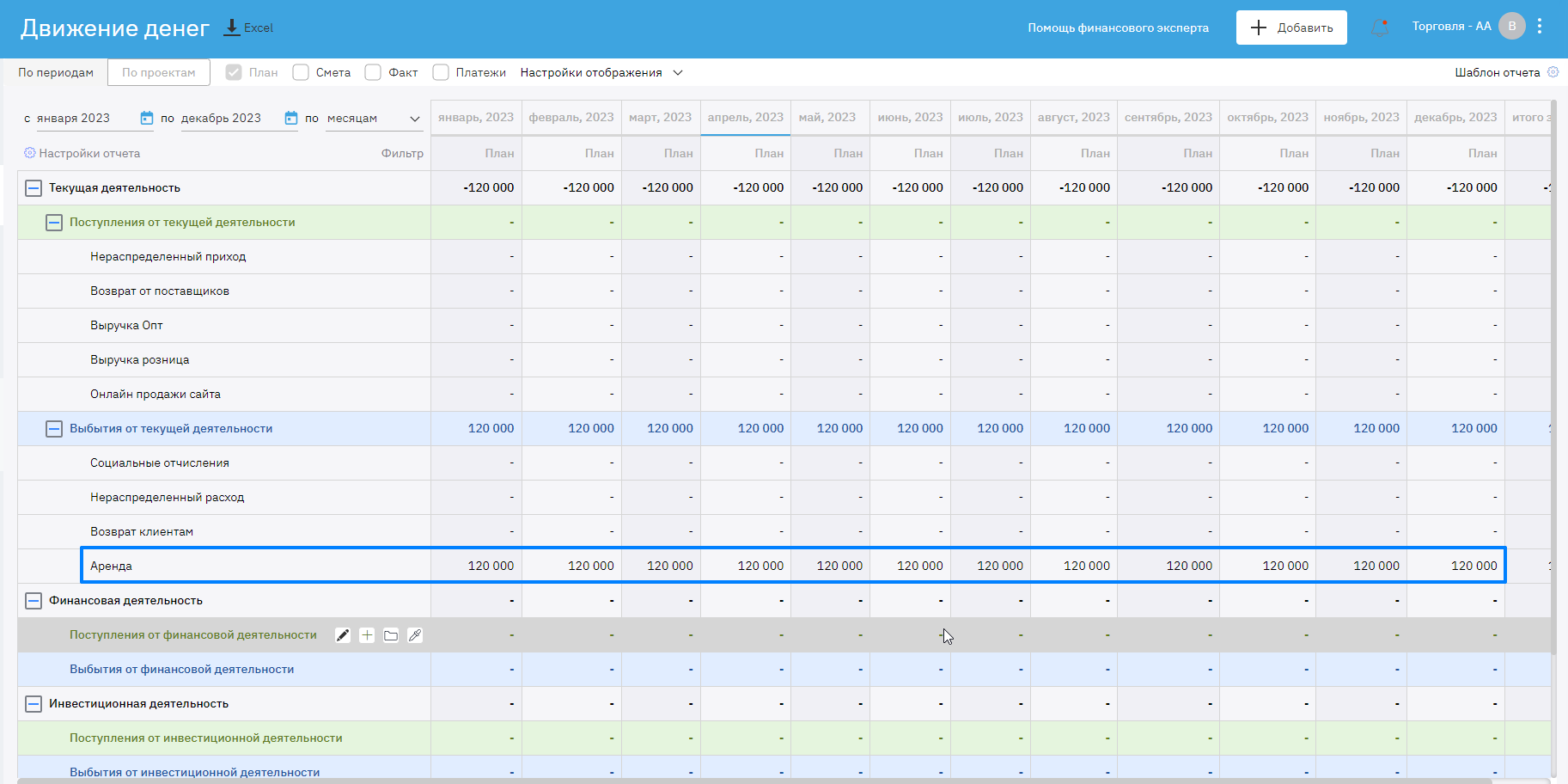 В отчёте ДДС в плане по статье Аренда автоматически проставилась сумма 120 000 руб. (с учётом НДС):