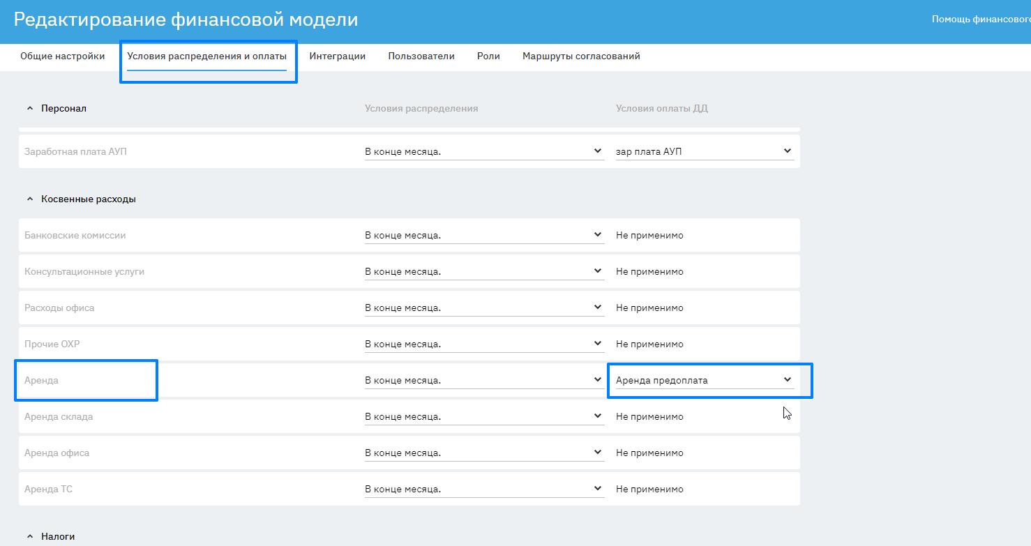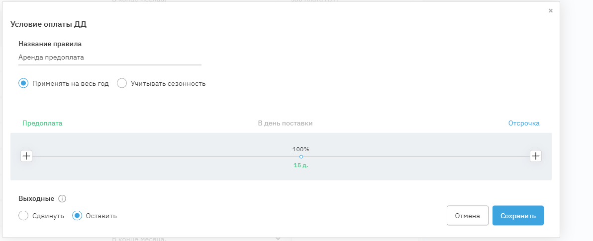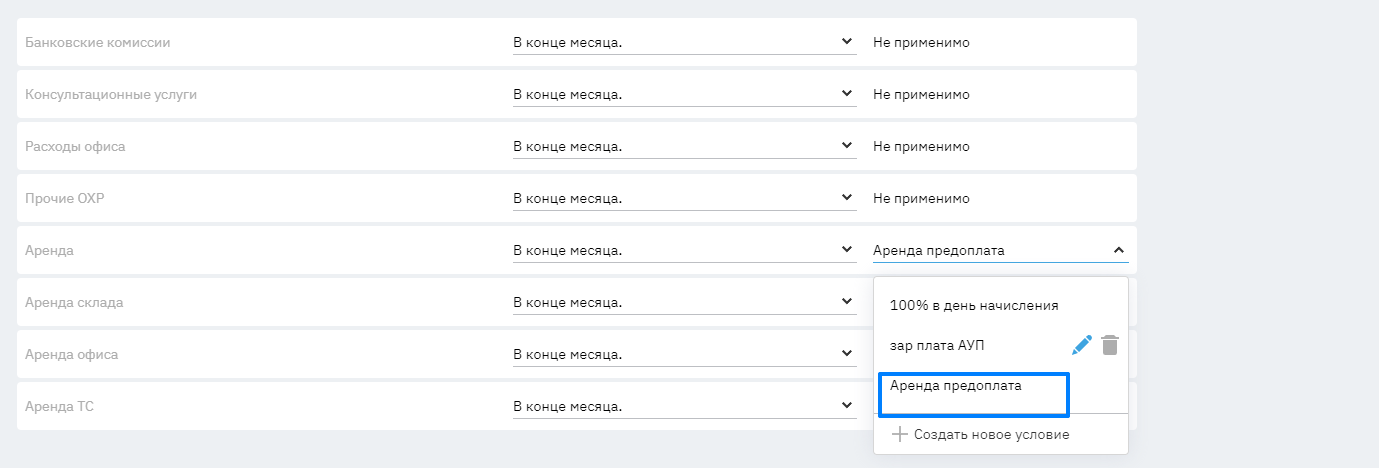Например, за Аренду 100% предоплата за 15 дней до начисления.