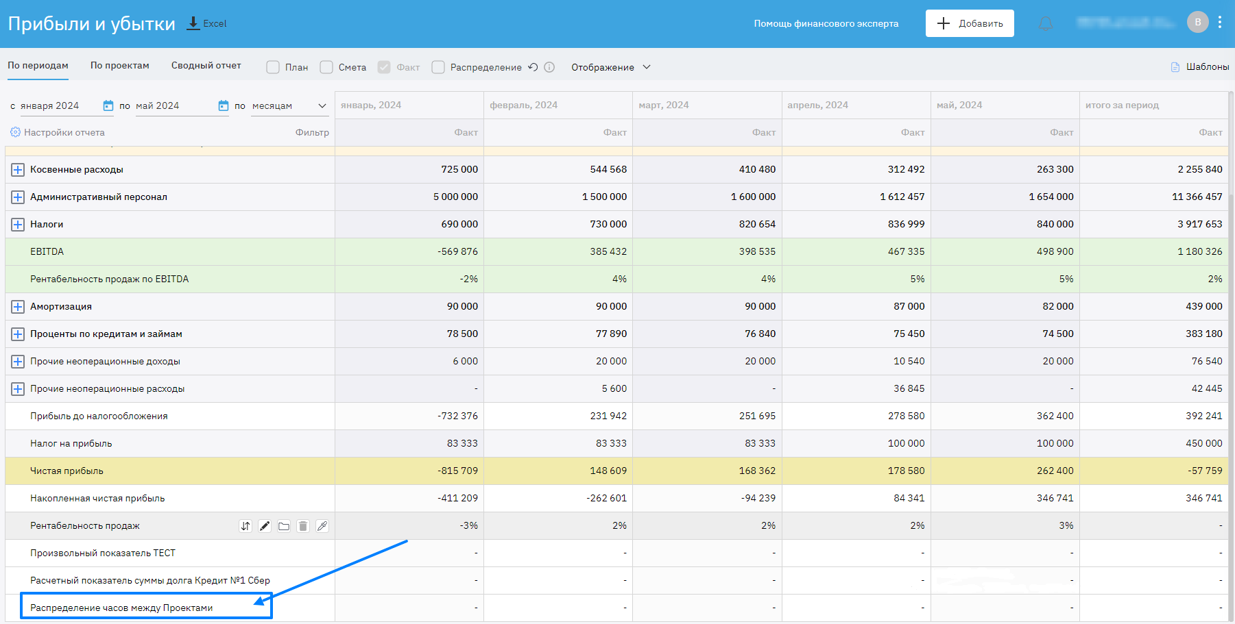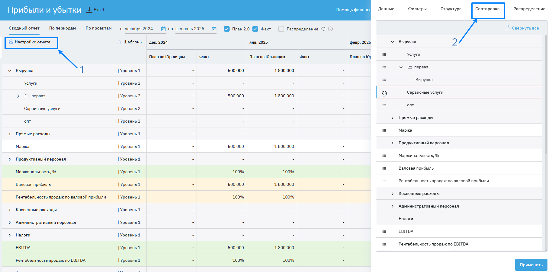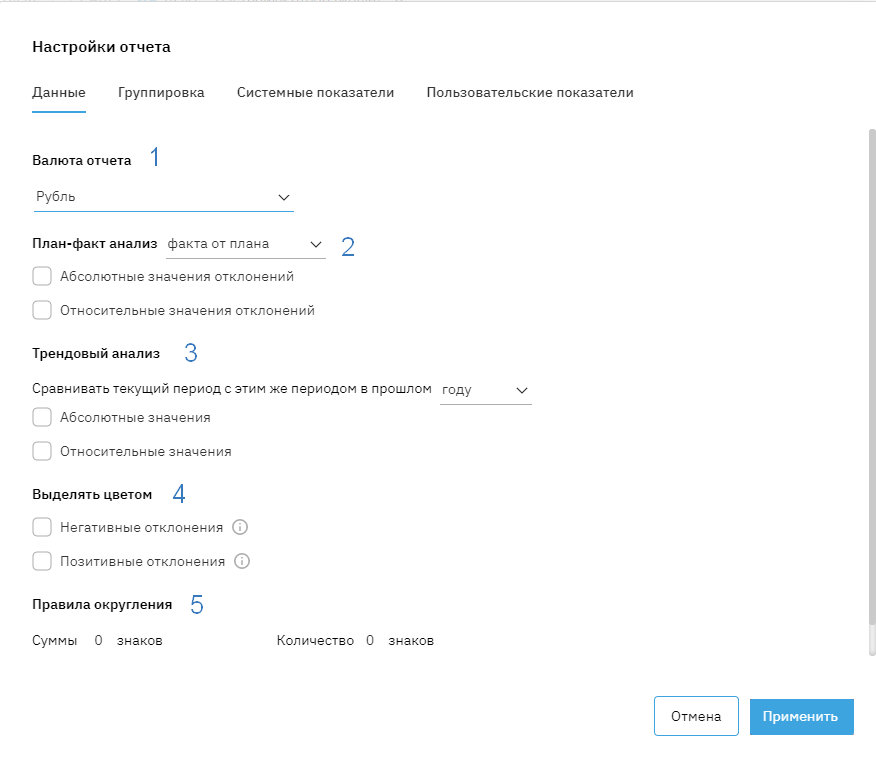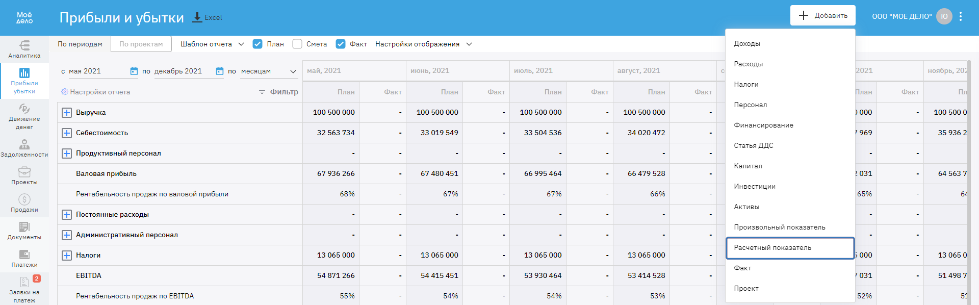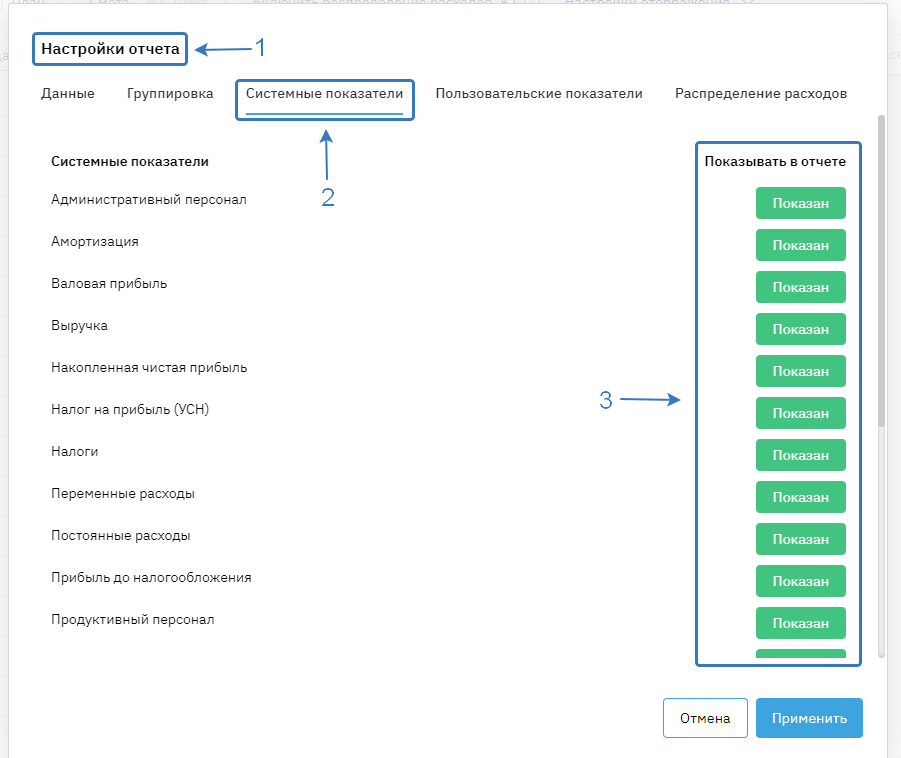 Вы можете переключать отображение системных и пользовательских показателей (1). Например, можно убрать показатели EBITDA или «Валовая прибыль».