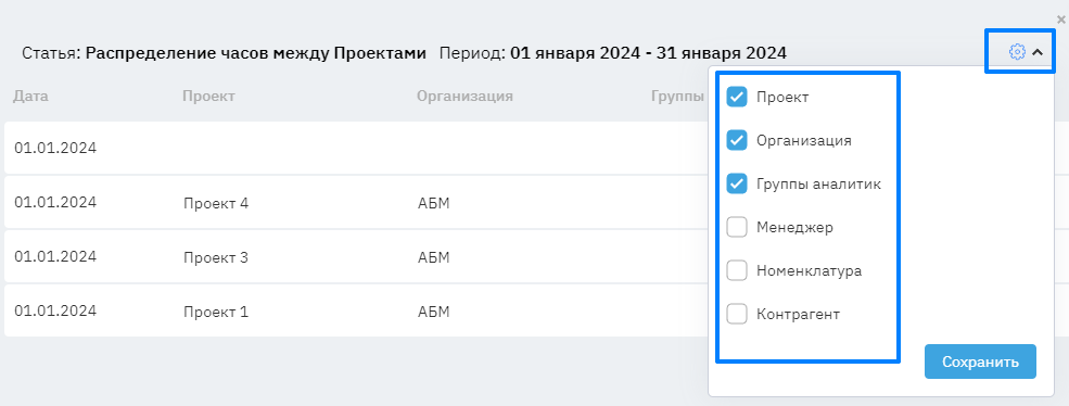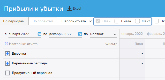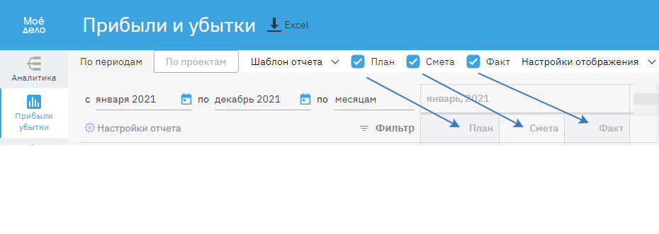 Выберите галки в графах «План», «Смета», «Факт» для настройки отображения необходимых столбцов: