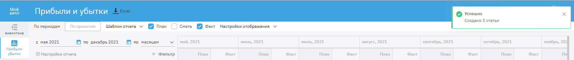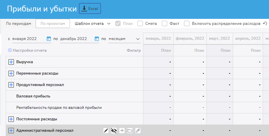 Например, в сквозной статье Аренда, в отчёте ПиУ мы проставили план 100 000 руб. ежемесячно: