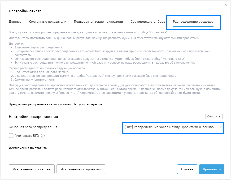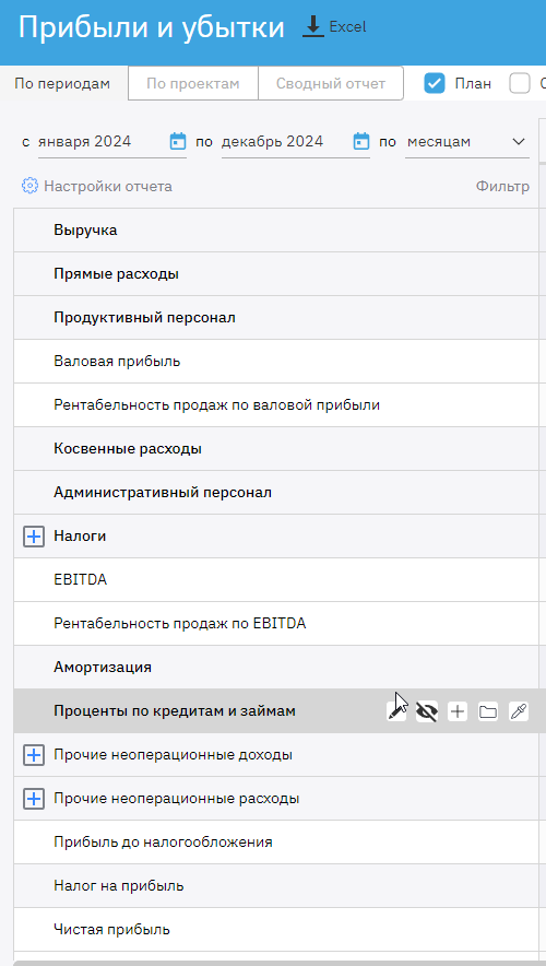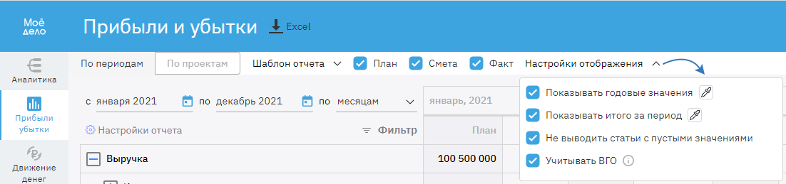 При нажатии на кнопку «Настройки отчёта» вам будет доступно редактирование отчёта о прибылях и убытках.
