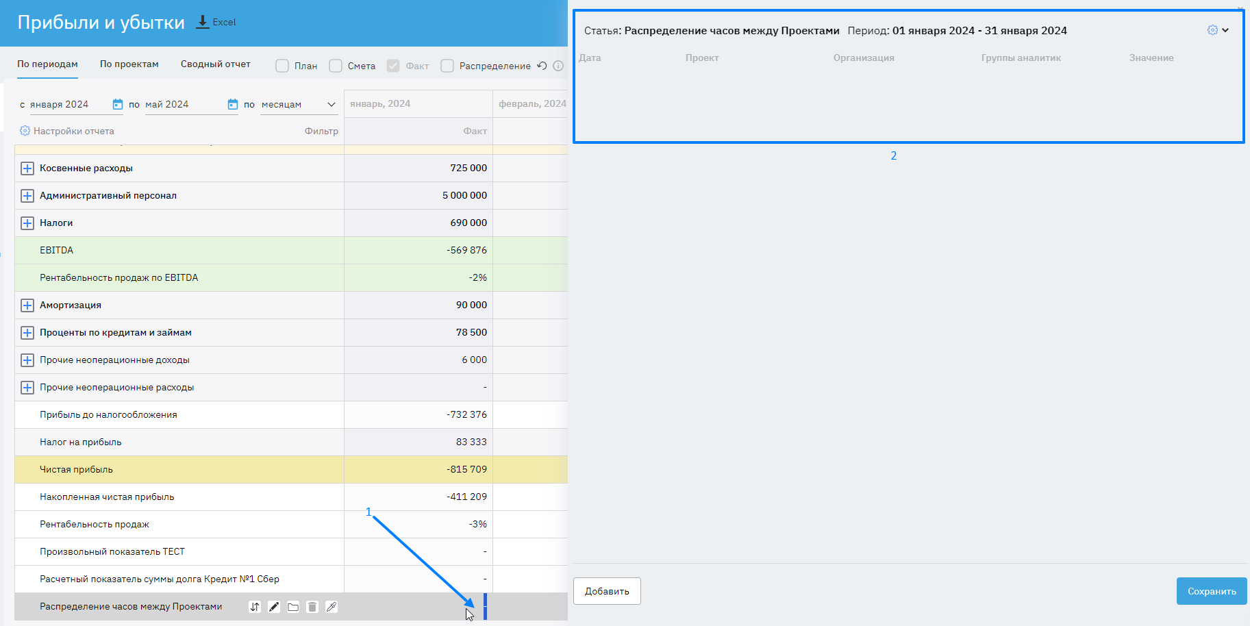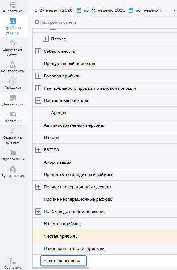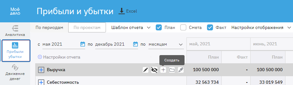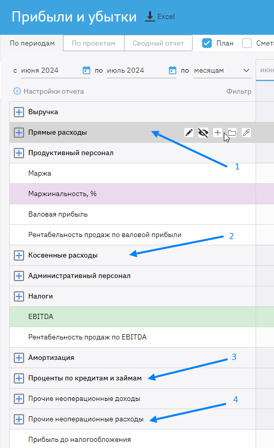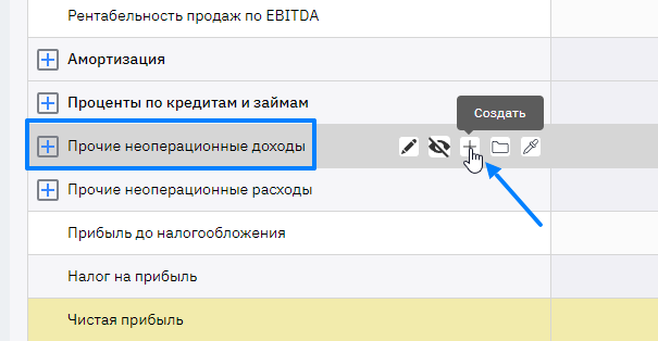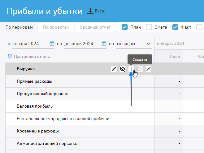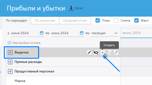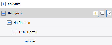 Для этого зайдите в отчёт «Прибыли и убытки», выберите раздел, в которых хотите добавить статьи, и нажмите на значок в виде плюса.