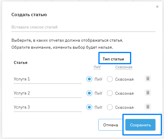 Выберите, в каких отчётах должна отображаться статья: только в ПиУ или сквозная. Обратите внимание, изменить выбор будет нельзя.
