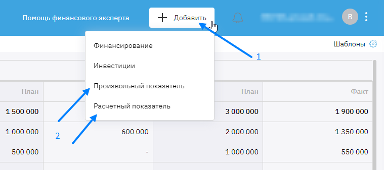 Для создания собственных показателей выберите «Добавить» (1) — «Произвольный показатель» или «Расчётный показатель» (2).
