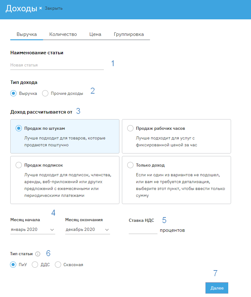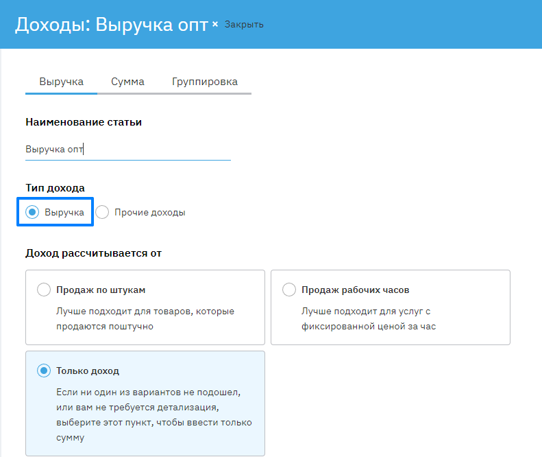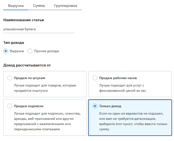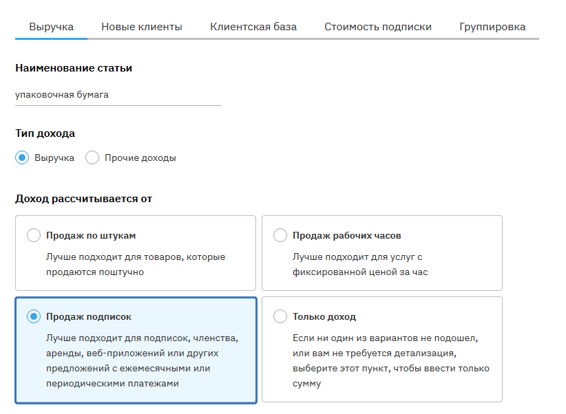 3. Выберите, как будет рассчитываться выручка, вы можете указать по продаже штуками, по продаже рабочих часов, по продаже подписок или указать только доход.