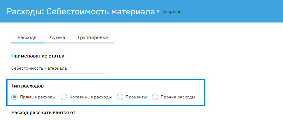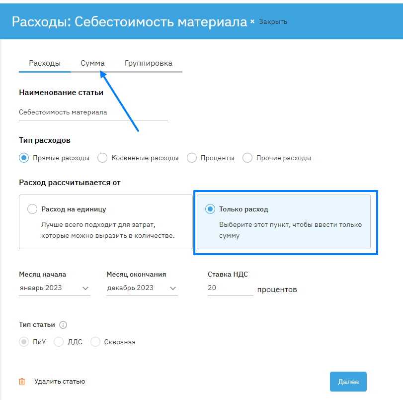 При выборе «Только расход» появится вкладка сумма. Шаг «Сумма» заполняется точно также, как и в предыдущем варианте (Стоимость).