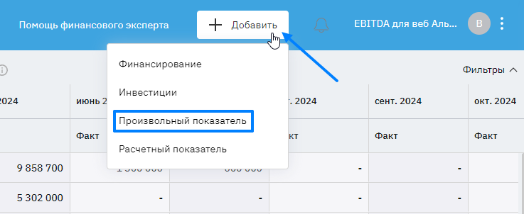 Для того чтобы добавить Произвольный показатель, нажмите на кнопку «Добавить» в правом верхнем углу экрана и выберите «Произвольный показатель»: