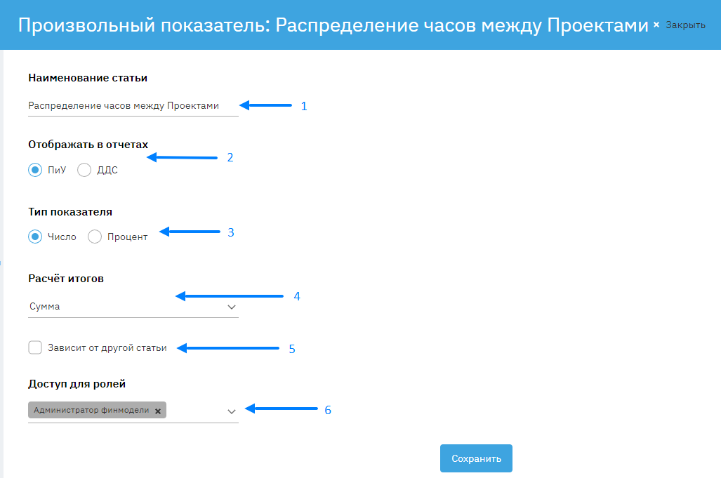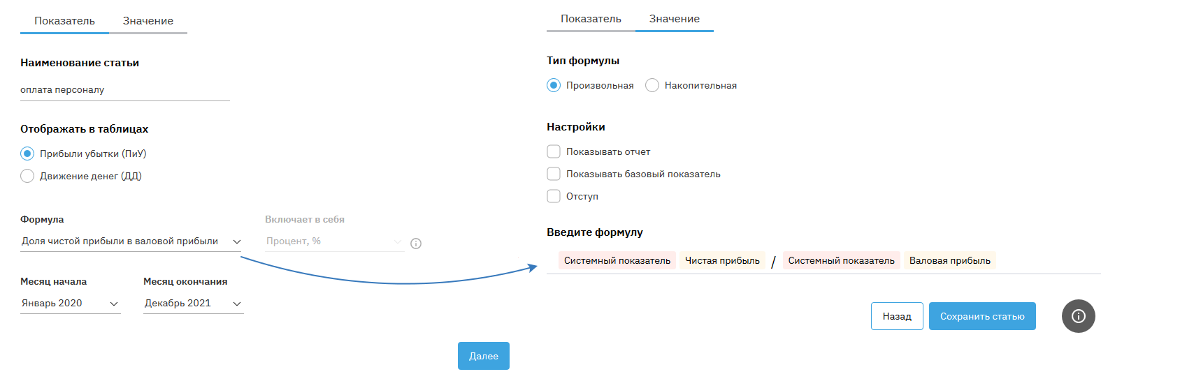 Если вы выбрали произвольную формулу, то вам нужно будет указать её вручную, вы можете использовать знаки + - / * и статьи финансовой модели.