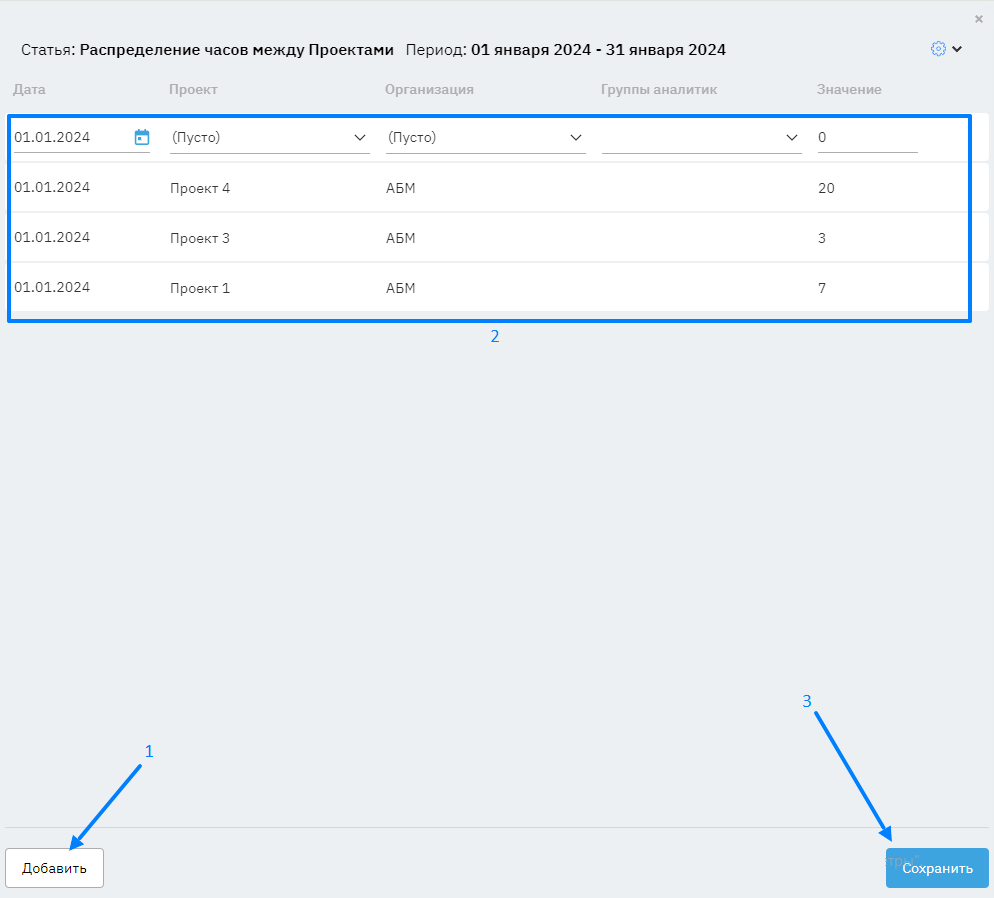 Затем нажмите кнопку «Добавить» (1), введите значения показателя (2) и нажмите «Сохранить» (3):