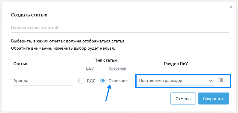 При создании сквозной статьи из Отчёта ДДС вы можете указать, в какой раздел отчёта ПиУ отнести данную статью: