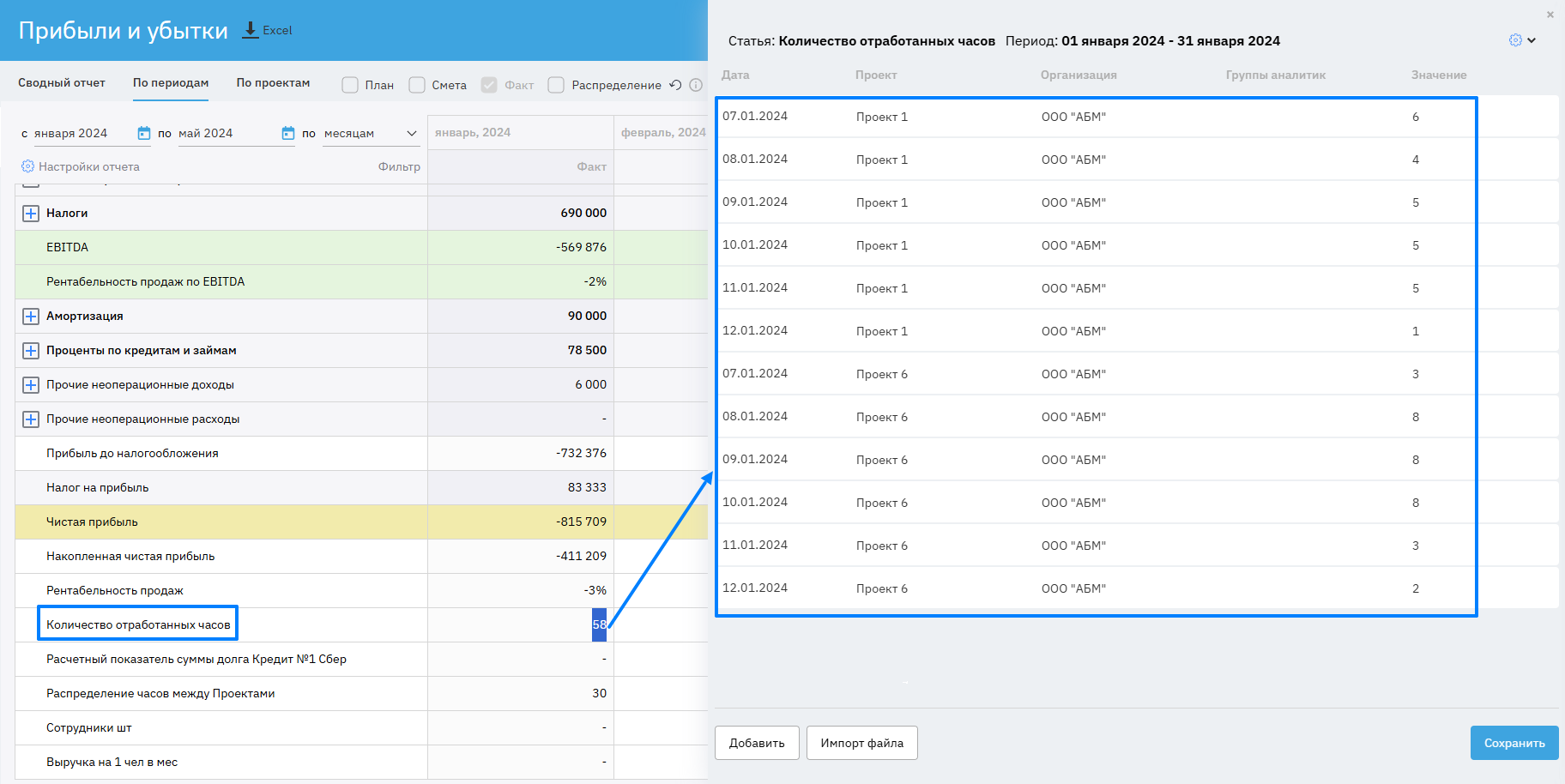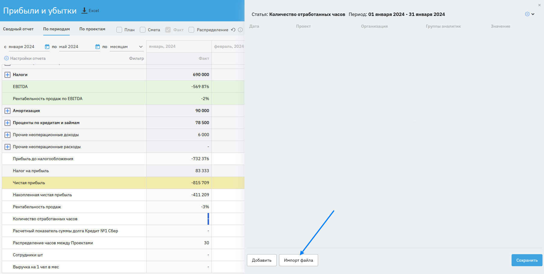 Для этого в отчёте двойным щелчком мышки нажмите на ячейку (пересечение показателя и нужного месяца). В инфо-панели нажмите на кнопку «Импорт файла»: