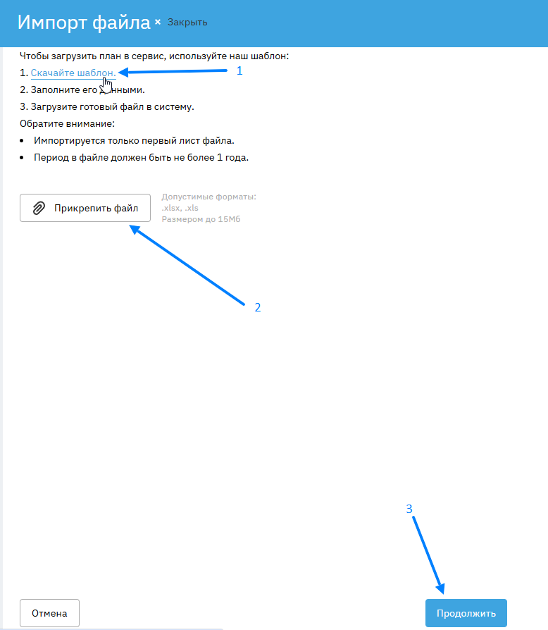 Скачайте и заполните шаблон файла excel (1), прикрепите его (2) и нажмите кнопку (продолжить):