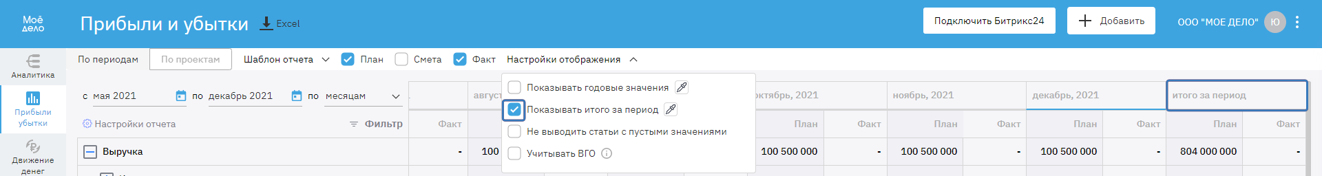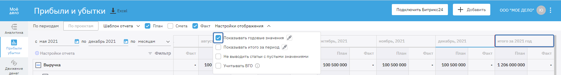 При включенной галке в графе «Показывать годовые значения» сервис добавит в отчёт столбец «Итого за год» с расчётом: