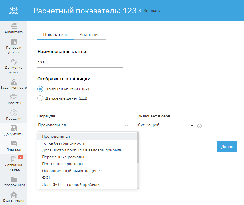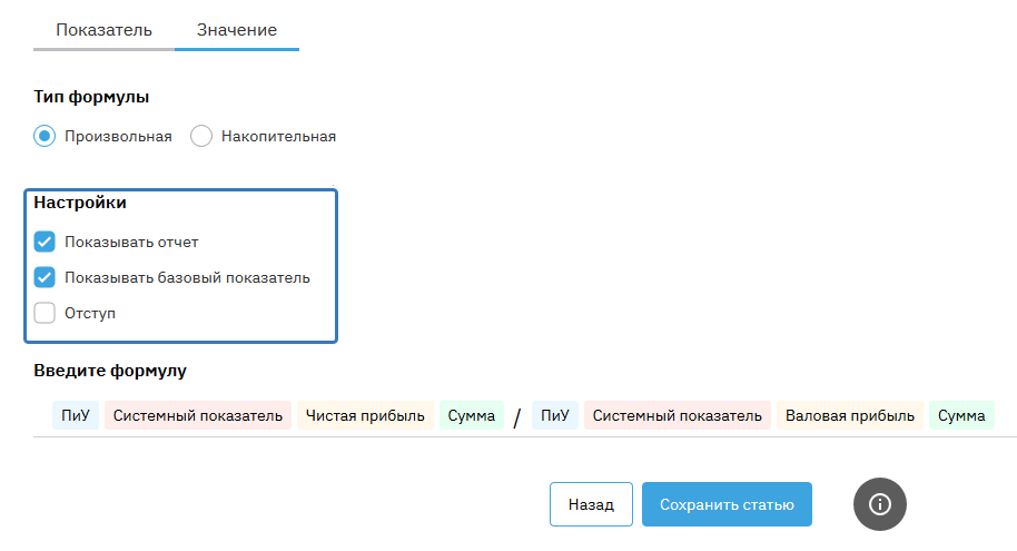 Например, точка безубыточности включает в себя сумму в рублях, доля фонда оплаты труда в валовой прибыли включает в себя процент, а если вы выбираете произвольную формулу, то можете выбрать какое именно значение он в себя включает: