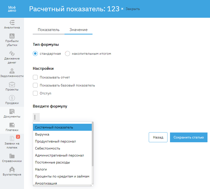 Укажите название показателя, затем выберите отчёт, в котором он будет отображаться. В графе «Формула» выберите из выпадающего списка тип показателя, и что он в себя включает.