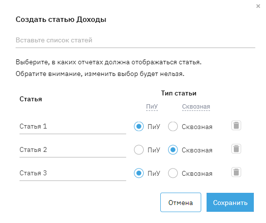Если в вашей структуре отчётов есть одинаковые статьи (и в отчёте ДДС, и в отчёте ПиУ), то при создании статьи вы можете воспользоваться типом «Сквозная». Статья продублируется сразу в 2 отчёта.