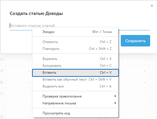 Скопируйте в стоблец из таблицы, вернитесь в сервис. Затем нажмите правой кнопкой мыши на поле для ввода и выберите «Вставить» или воспользуйтесь сочетанием клавиш Ctrl + V на клавиатуре для вставки: